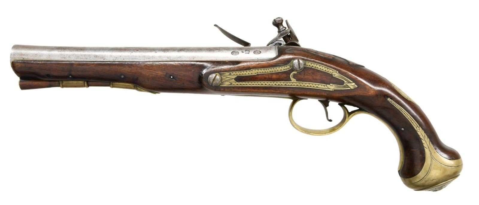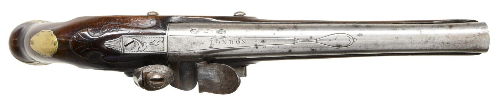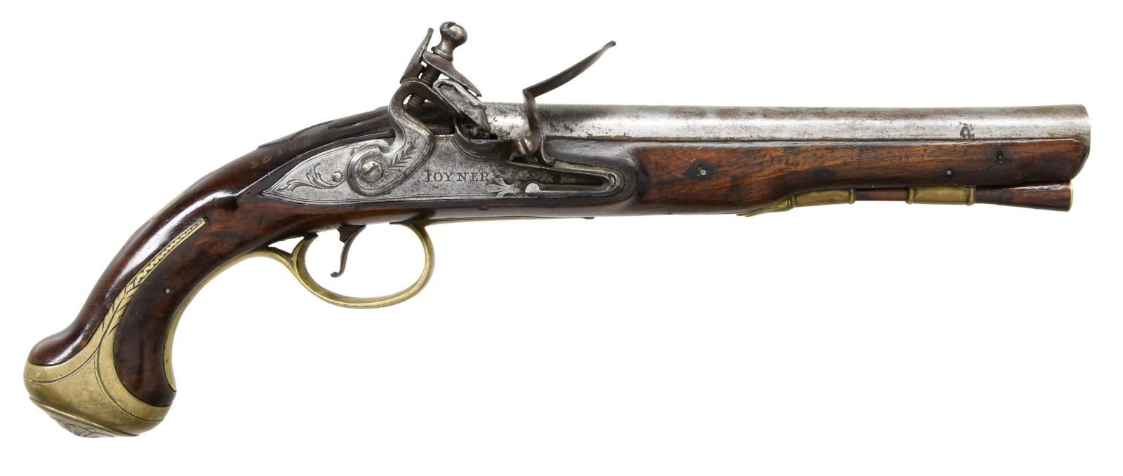 HOLSTER PISTOLS BY JOHN JOYNER. Cal. 60. S# NSN. This attractive pair of pistols have 8" swamped round barrels engraved "LONDON" on tops. London gunmakers proofs and the initials "IJ" are at top left of breech ends. Locks with rounded plates and high breasted serpentine cocks have integral pans, unbridled friction frizzens and feather springs with fleur-de-lis finials. Lockplates have line border engraving and scroll on tails. "Ioyner" is at centers under pans (John Joyner working in London 1761-1780). Dark European walnut stocks extend to muzzles and are pinned to barrels. Brass mounts are line border engraved with some floral highlights. Knob grip caps have side spurs. Side plates are attractively skeletonized. There is some attractive raised carving around barrel tangs and the #'s "1512" "15131" are to the right of this carving. Hickory ramrods have brass caps and mount through beaded single brass pipes and matching thimbles. CONDITION: good. Metal parts cleaned to silver gray. Locks with light pitting. Stocks have old oil refinish over many marks. Brass is good, nicely toned. Bores are pitted. Locks operable. There are no noted repairs or replacement parts. Stocks are sound with no noted cracks or loses except a 1" chip at lower front lockplate of gun 1512. (01-24077/MGM). ANTIQUE. $4,000-6,000.