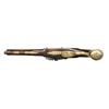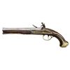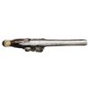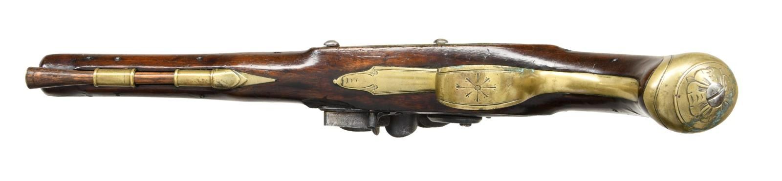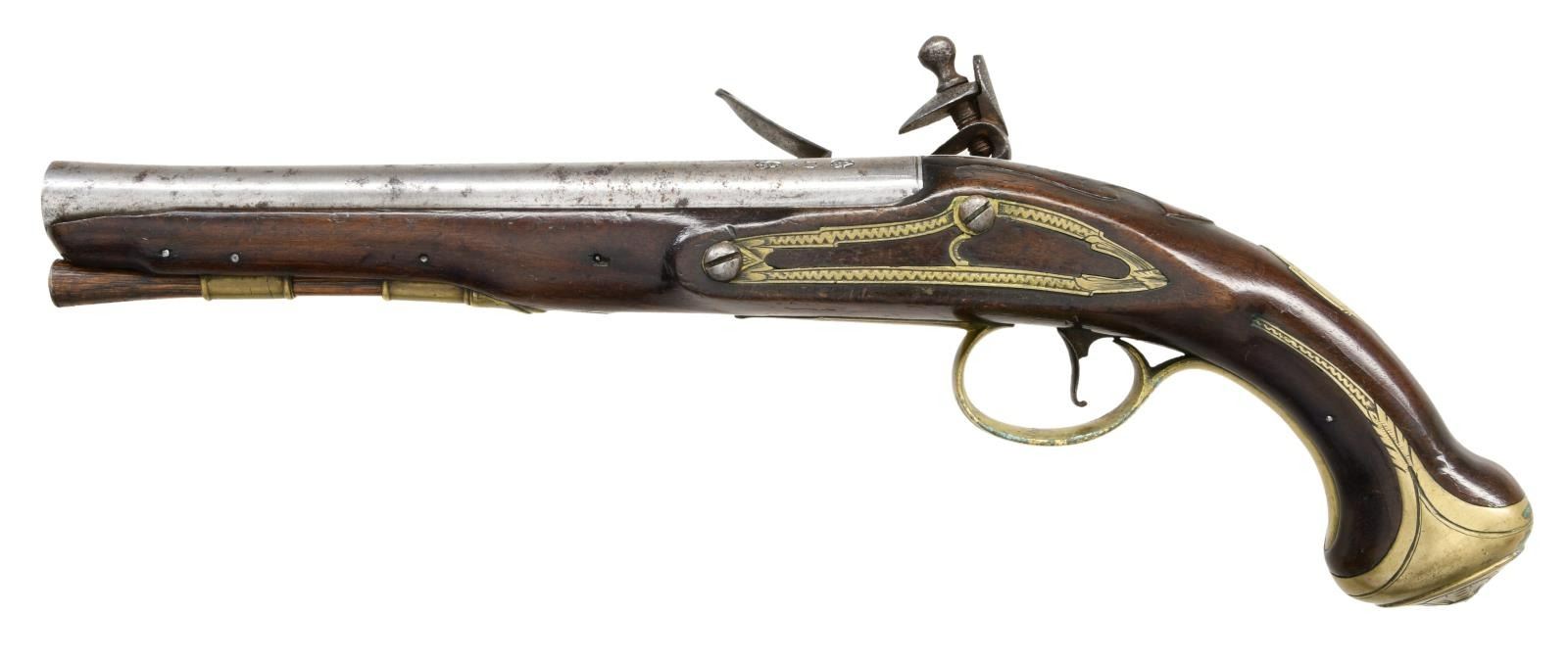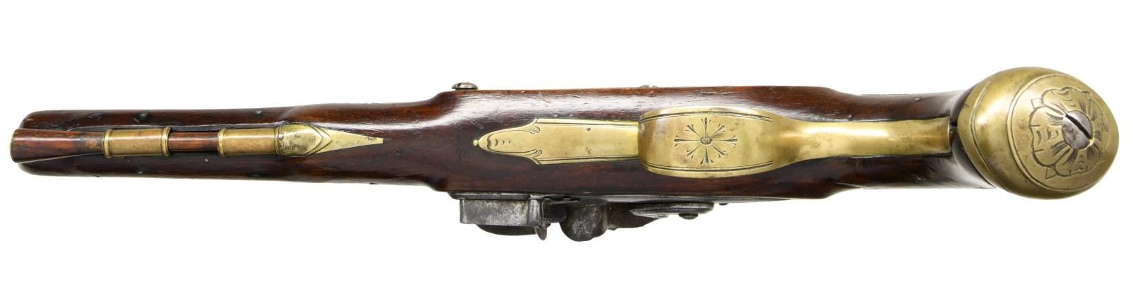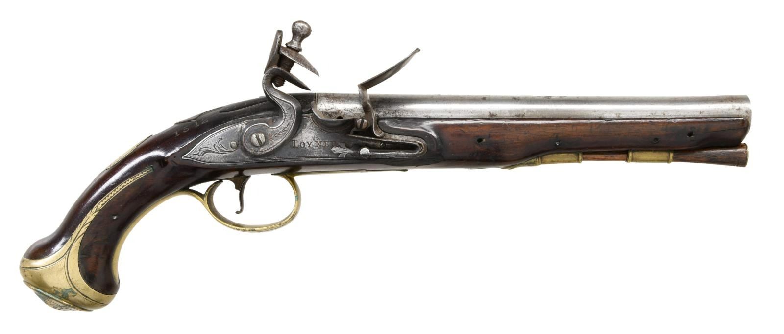 HOLSTER PISTOLS BY JOHN JOYNER. Cal. 60. S# NSN. This attractive pair of pistols have 8" swamped round barrels engraved "LONDON" on tops. London gunmakers proofs and the initials "IJ" are at top left of breech ends. Locks with rounded plates and high breasted serpentine cocks have integral pans, unbridled friction frizzens and feather springs with fleur-de-lis finials. Lockplates have line border engraving and scroll on tails. "Ioyner" is at centers under pans (John Joyner working in London 1761-1780). Dark European walnut stocks extend to muzzles and are pinned to barrels. Brass mounts are line border engraved with some floral highlights. Knob grip caps have side spurs. Side plates are attractively skeletonized. There is some attractive raised carving around barrel tangs and the #'s "1512" "15131" are to the right of this carving. Hickory ramrods have brass caps and mount through beaded single brass pipes and matching thimbles. CONDITION: good. Metal parts cleaned to silver gray. Locks with light pitting. Stocks have old oil refinish over many marks. Brass is good, nicely toned. Bores are pitted. Locks operable. There are no noted repairs or replacement parts. Stocks are sound with no noted cracks or loses except a 1" chip at lower front lockplate of gun 1512. (01-24077/MGM). ANTIQUE. $4,000-6,000.