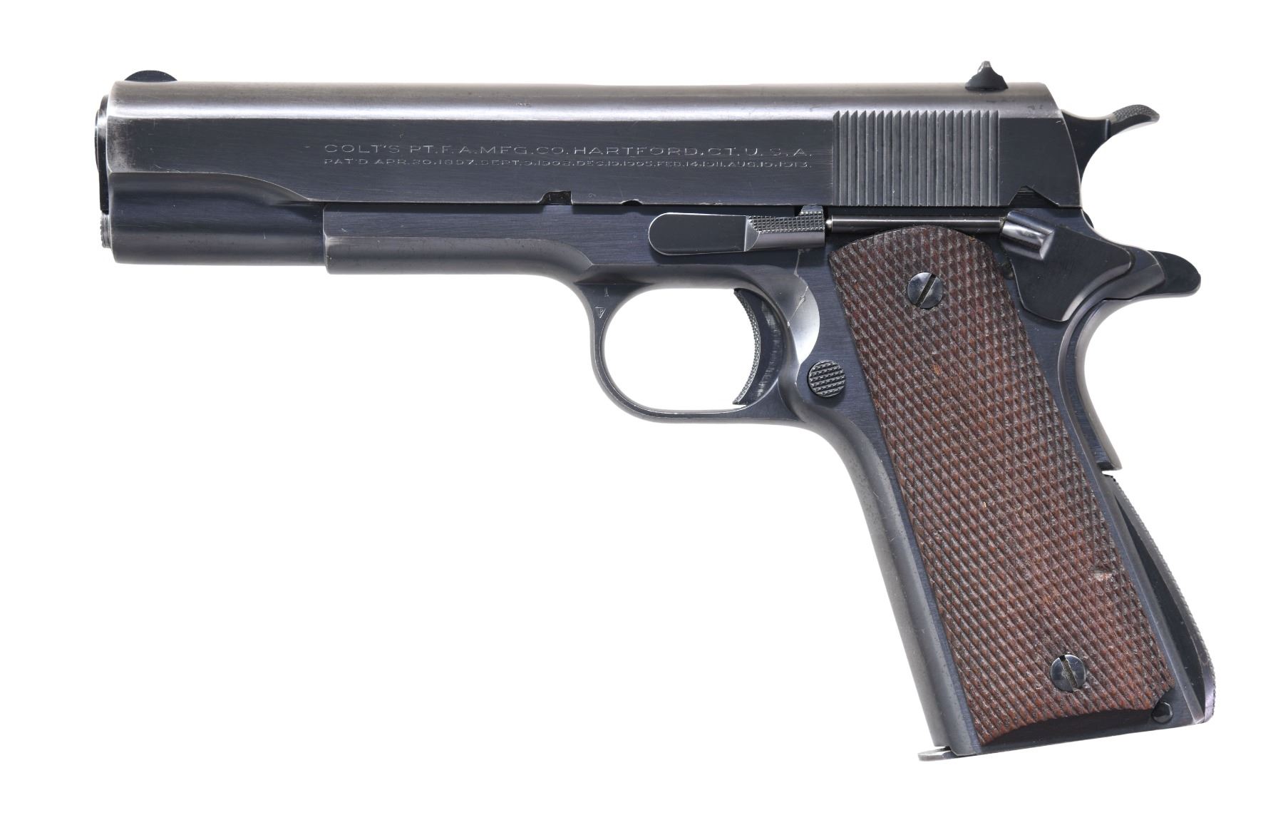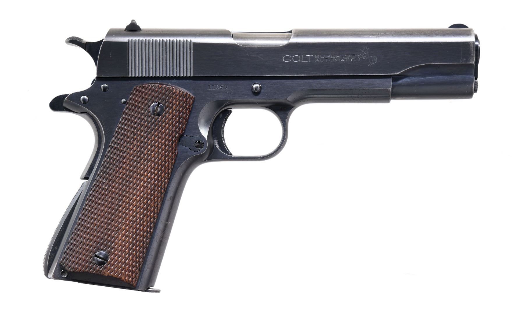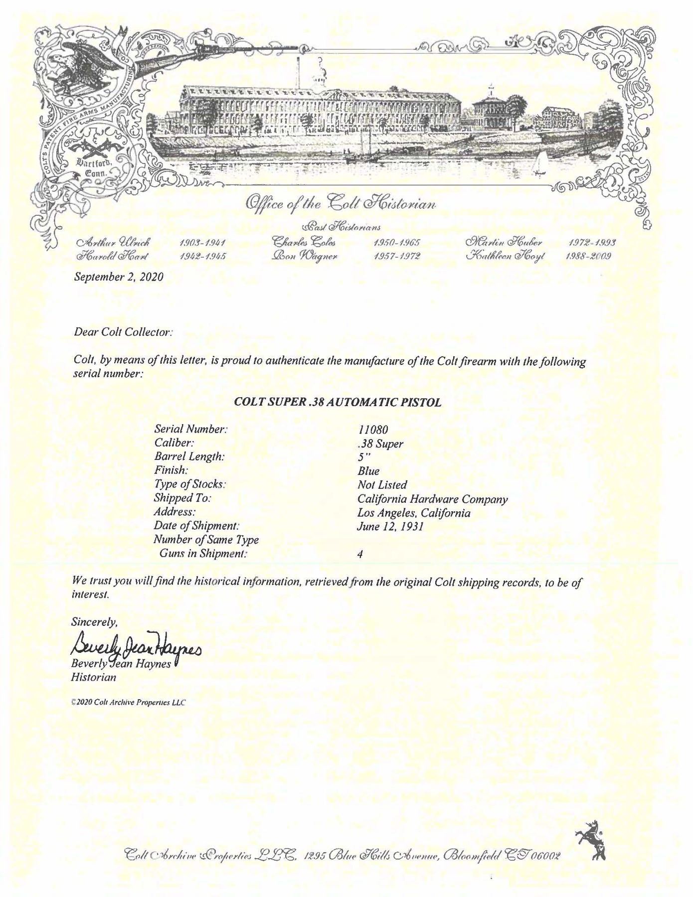 LETTER. Cal. 38 Super. S# 11080. This pistol was shipped to the California Hardware Company in Los Angeles, CA on June 12th, 1931 in a 4 gun shipment. This has an identical configuration of Colt Commercial Government Model pistols with 1911A1 features except in 38 Super. Barrel 5". Matching numbered slide. Fully checkered walnut grips. Bottom of Mainspring housing hand scratched "TR / 4-6-50". MAGS: 1 two tone 9 rd. having good appearance with wear, patina & hand scratched "TR / 4-650 / 230A". UNATTACHED ACCESSORIES: Colt letter as stated above. CONDITION: frame has over 90% original blue finish with scratches & wear on front strap & noticeable scratch on left side from slide stop assembly, along with scattered light scratches & pinprick oxidation. Slide has approx. 75% original blue with large area of cleaned light patina & pitting on top of slide mixing with cold blue touch up finish. Balance of slides has scattered pinprick patina & light scratches with 1 small spot of worn finish on bottom of slide. Very good grips with couple of small gouges on left panel & scattered flattened diamonds on panels. Barrel has very good original blue with light cycling wear; bore is very good with strong rifling. (25-1152/md). CURIO. $7,500-12,500.
