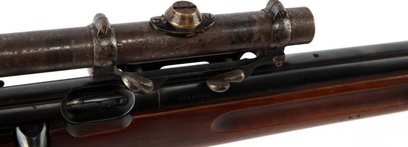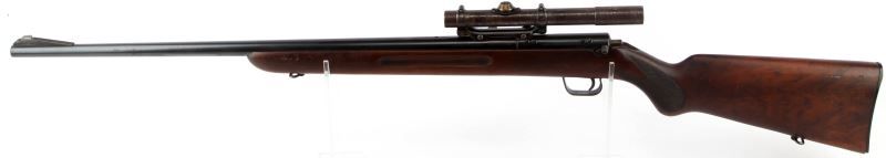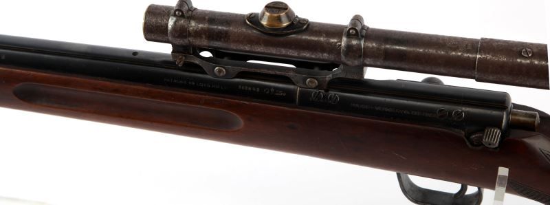 Pre-war German Mauser .22 caliber training rifle, with Zeiss optics on Akah scope mount. Mauser logo on right side of butt-stock. Receiver marked on left side "MAUSER-WERKE A G OBERNDORF" Left side of barrel marked "PATRONE 22 LONG RIFLE" with serial number and nitro proof. Scope marked with "Carl Zeiss Jena" logo, and "Zielklein". Patent marks on right side of barrel and scope mount. Bore is bright and clean, and bluing remains about 85%+. Expected wear and patina to stock, but no cracks or damage. Scope shows significant finish loss and pitting, but optics remain clear and sharp. Overall very good condition for the age. Caliber: .22 LR Serial #: 11364 This lot has a reserve.