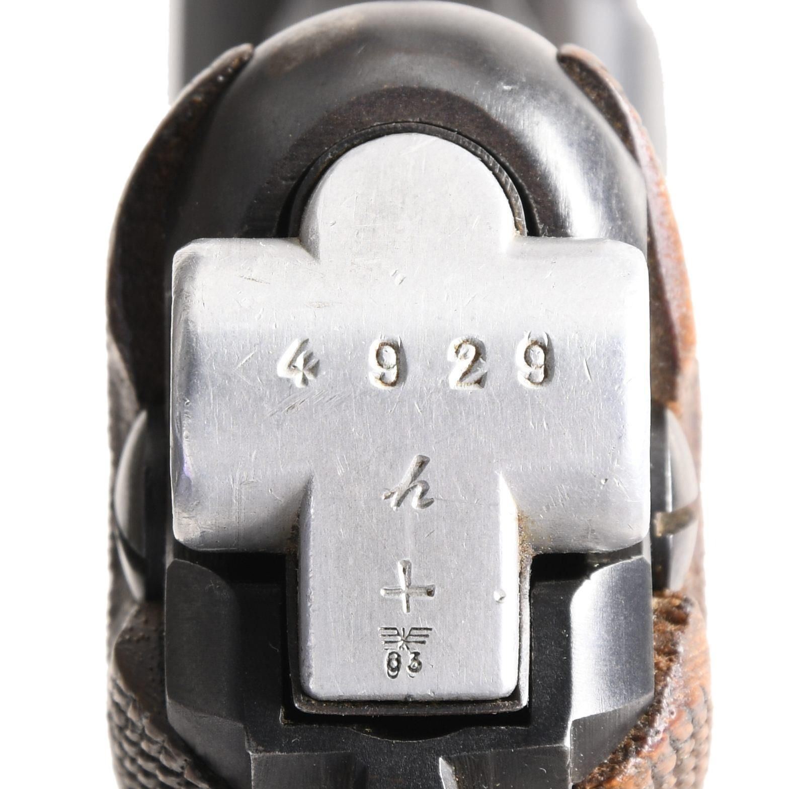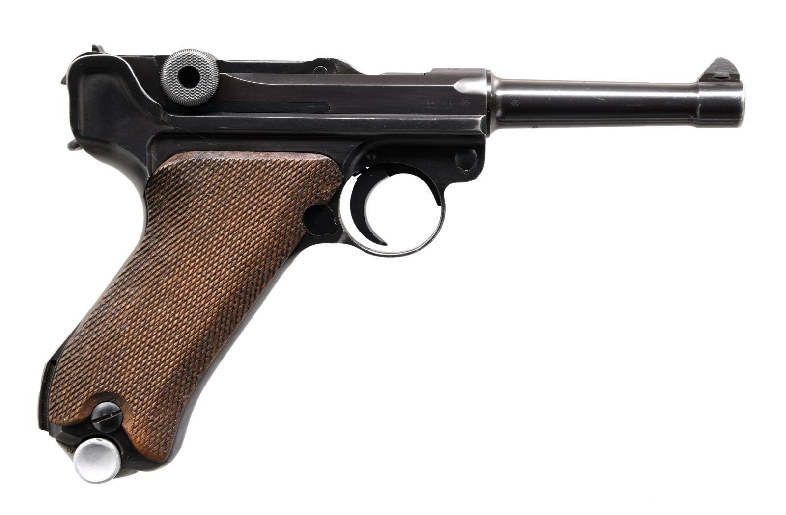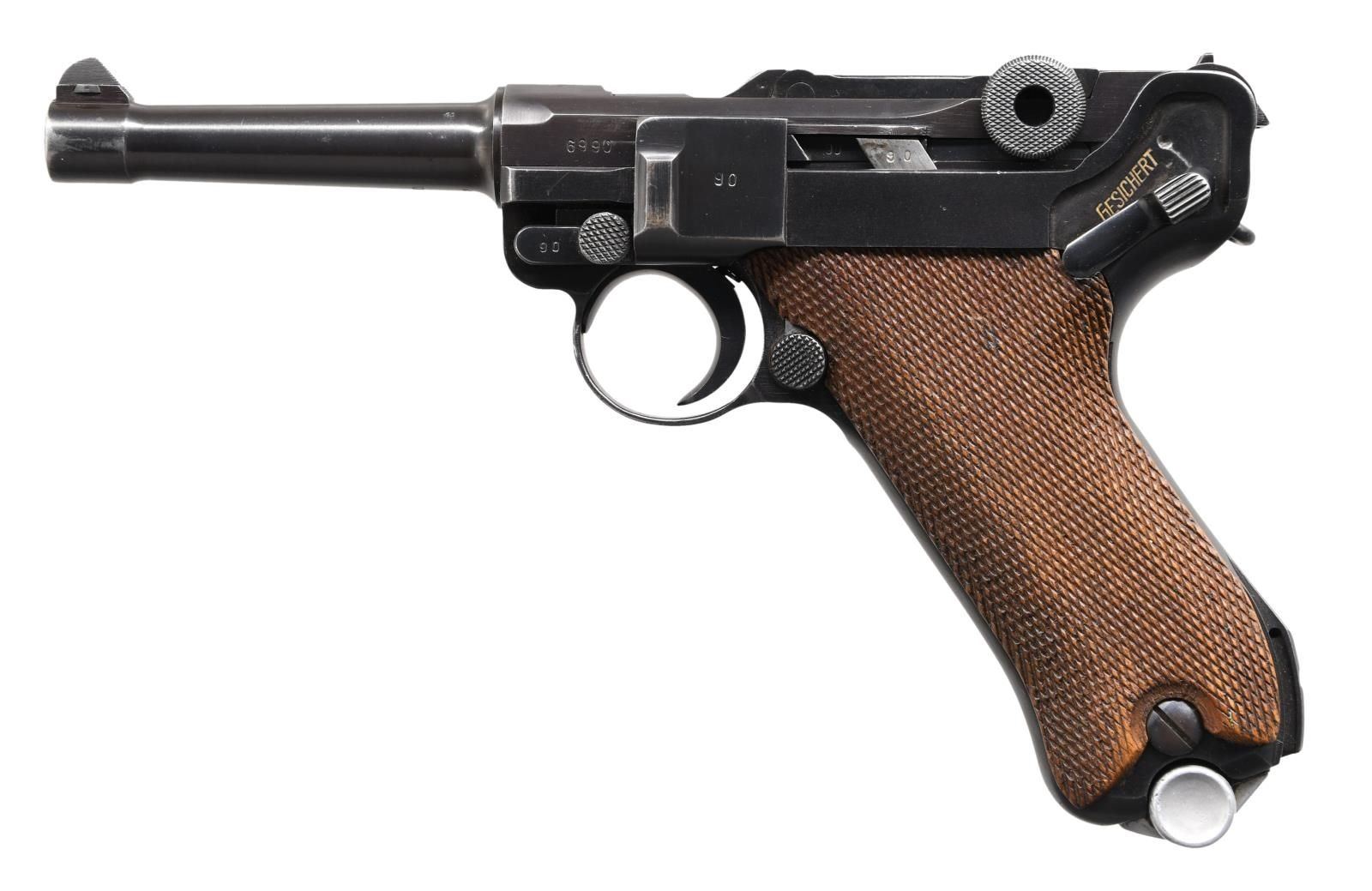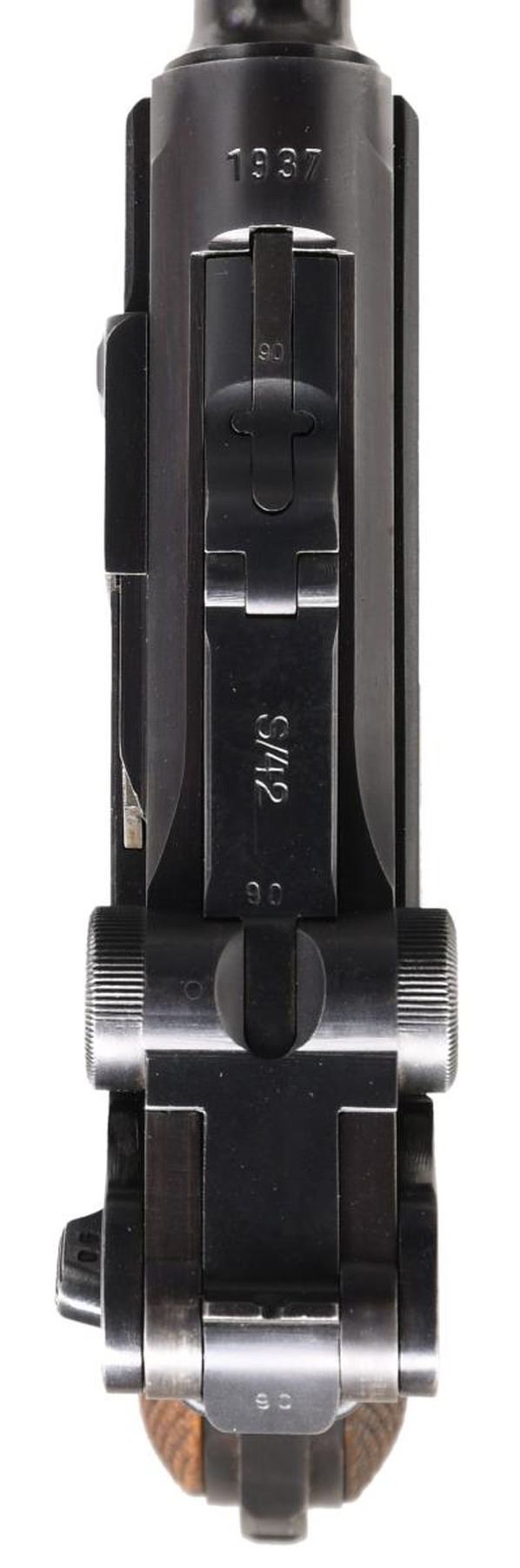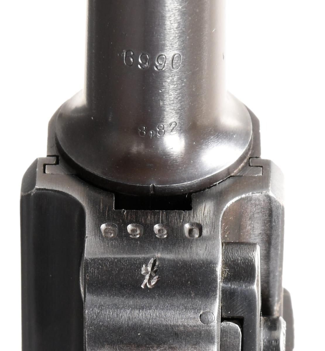 SEMI-AUTOMATIC PISTOL. Cal. 9x19mm Parabellum. S# 6990t. Bbl. 4". P.08 Luger semi-automatic pistol mfg. by Mauser in 1937. Top of bbl. extension is marked "1937", with Eagle/63 acceptance proofs and an eagle firing proof marked on the right. Toggle is marked with Mauser's "S/42" mfg. code. Metal components exhibit an original salt blue finish. Frame is mounted with 2-piece checkered wood grips. All numbers are matching, with the exception of the aluminum bottom mag "S# 4929h". CONDITION: very good, with metal components retaining the majority of their original salt blue finish, exhibiting some edge wear, some wear around the muzzle on the bbl., as well as a small spot of wear on the toe of the frame. Mirror bore, exhibiting some light pitting and oxidation while retaining strong rifling throughout. Grips exhibit smoothing, with some scattered marks from handling and storage, but otherwise remain sturdy and serviceable. (23-5605/MLW). CURIO. $2,000-3,000.