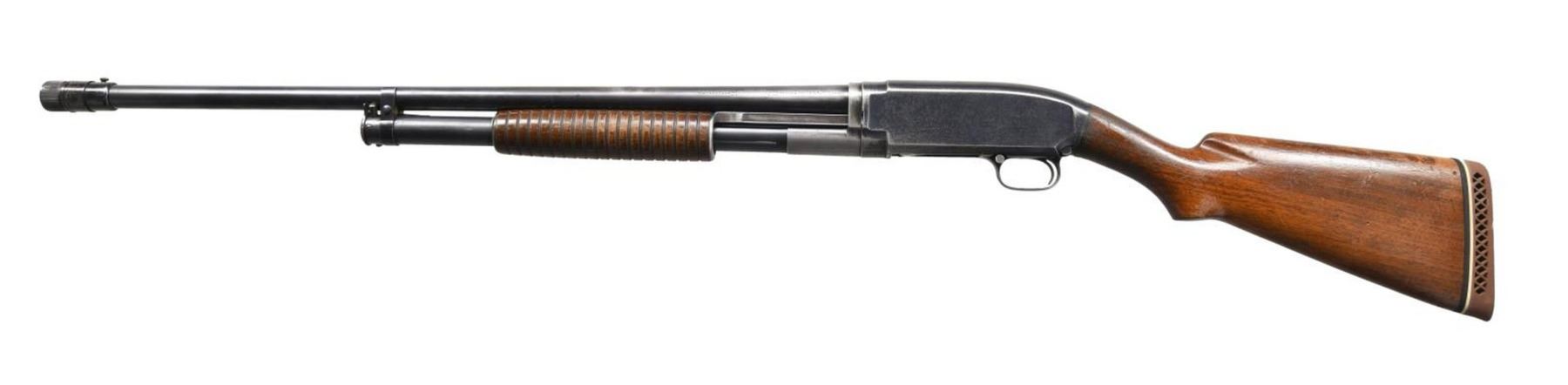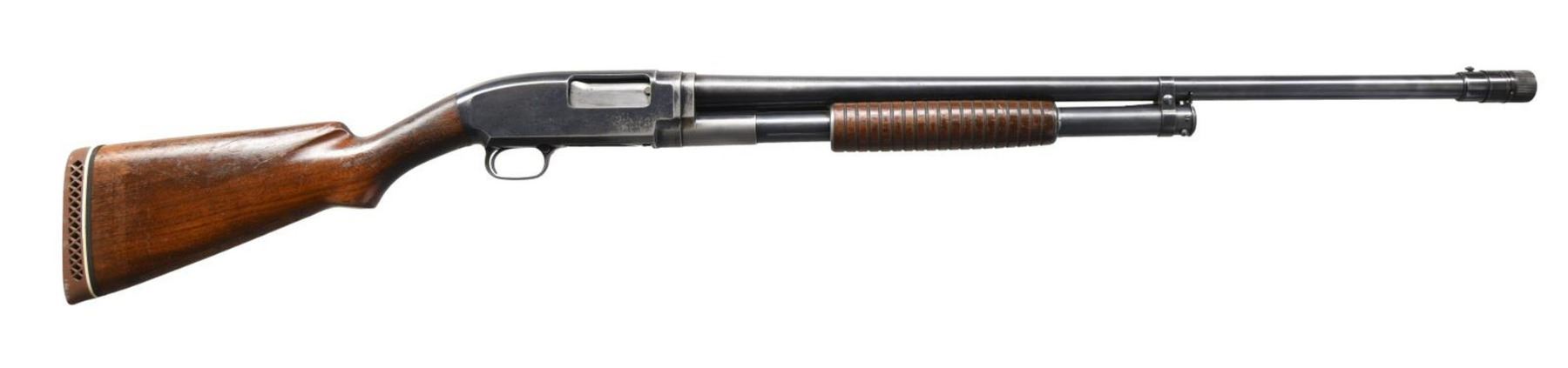 Cal. 12 GA. S# 323152. Bbl. 26 1/2". Model 12 pump action shotgun mfg. by Winchester in 1923. The left side of the bbl. is marked with the Winchester trademark logo, followed by the model and cal. designations. Metal components exhibit a blued finish overall. Plain wood buttstock with grooved forend. Muzzle has been fitted with a Poly Choke that features a brass bead front sight. Matching numbers are present on the receiver and bbl. CONDITION: metal components retain fair to good amounts of their original factory blue finish, exhibiting wear and thinning overall, with mild to moderate oxidation present on the receiver. Bright bore, exhibiting mild pitting throughout. Wood furniture shows scattered marks from handling and storage, as well as wear to their varnish finish, but otherwise remain sturdy and serviceable. (23-5337/MLW). CURIO. $300-400.