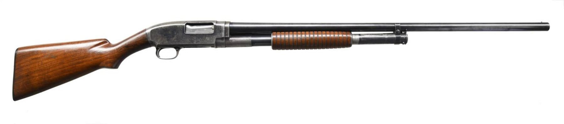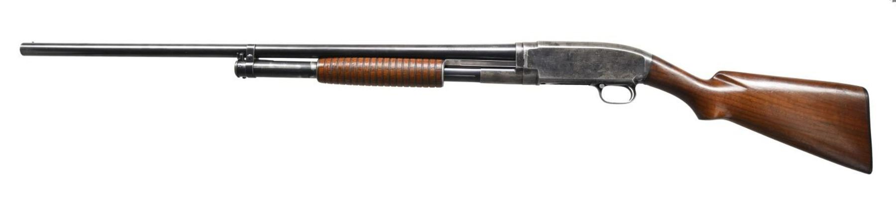 Cal. 12 GA. S# 336371. Bbl. 30". Model 12 pump action shotgun mfg. by Winchester in 1923. The left side of the bbl. is marked with the Winchester trademark logo, followed by the model and cal. designations, with Winchester's mfg. information on the right. Metal components exhibit a blued finish overall. Plain wood pistol grip buttstock and grooved pump. Aluminum bead front sight. Matching numbers are present on the receiver and bbl. CONDITION: receiver and mag. tube retain fair amounts of their original factory blue finish, exhibiting wear and thinning that show through to gray patina, with mild surface oxidation overall. Bbl. retains large amounts of its blue finish, exhibiting some spots of wear and thinning, with scattered surface oxidation. Mirror bore, exhibiting some mild firing residue. Wood furniture shows scattered marks from handling and storage, but otherwise remains sturdy and serviceable. (23-5399/MLW). CURIO. $250-375.