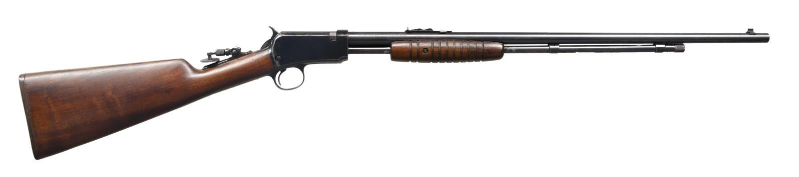 Cal. .22 S, L, & LR. S# 93153A. Bbl 23". Manufactured in 1939. Blued finish with smooth wood buttstock and grooved pump. Blade front sight w/ U-notch rear iron sight and tang mounted Lyman aperture sight. CONDITION: metal components retain large amounts of their original factory blue finish, exhibiting areas of wear, scattered handling marks, and areas of mild surface oxidation overall. Very bright bore, exhibiting strong rifling throughout. Wood furniture exhibits some scattered marks from handling and storage, but is otherwise very good. (23-2038/MLW). CURIO. $300-500.