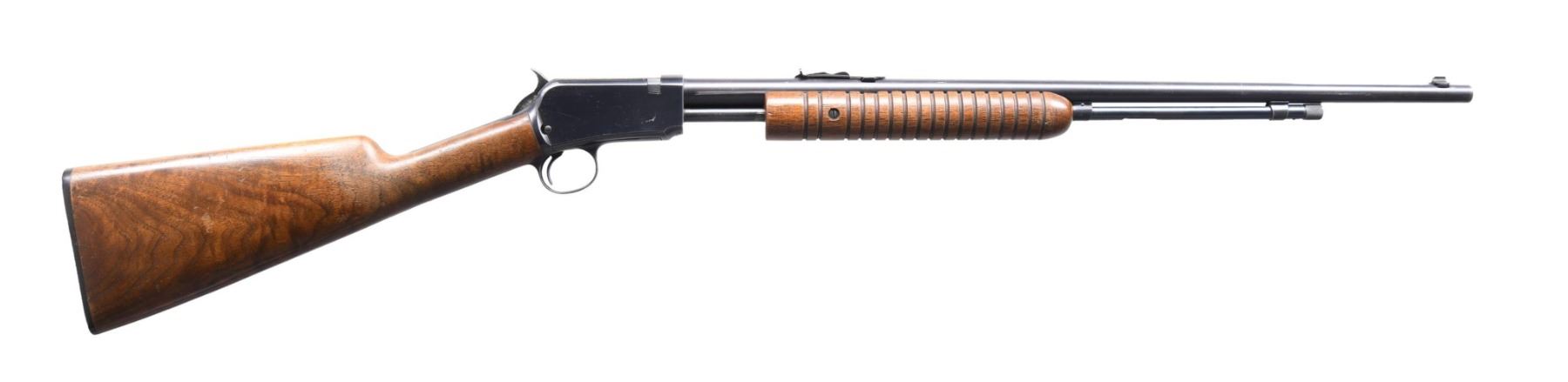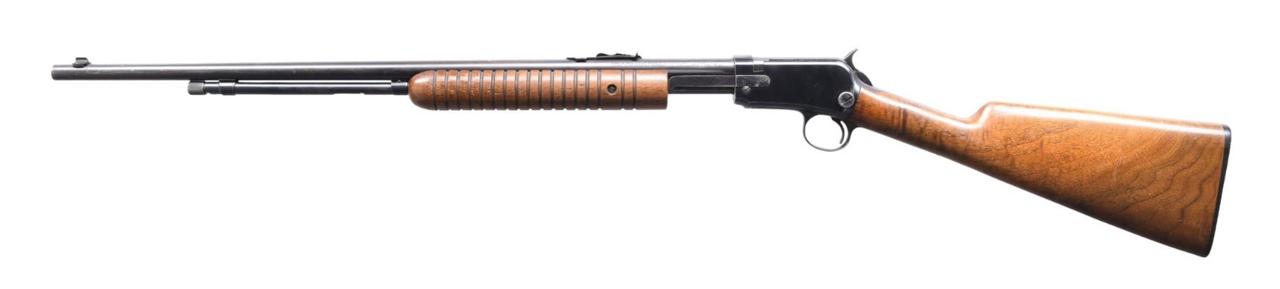 Cal. 22 S, L, LR. S# 104070. Bbl. 23". Model 62A slide action rifle mfg. by Winchester in 1940. Left side of the bbl. exhibits markings stipulating Winchester's mfg. information, as well as the model and cal. designations. Metal components exhibit a blue finish overall. Plain wood straight grip buttstock with grooved wood forend. White beaded Lyman blade front sight, with U-notch rear sight. Matching numbers are present on the upper and lower assemblies. CONDITION: metal components retain the majority of their original factory blue finish, exhibiting areas of wear and thinning, some superficial handling marks, as well as a few areas of light surface oxidation overall. Mirror bore, exhibiting strong rifling throughout. Wood furniture shows some scattered marks and minor impressions from handling and storage, but otherwise remains sturdy and serviceable. (24-5716/MLW). CURIO. $500-800.