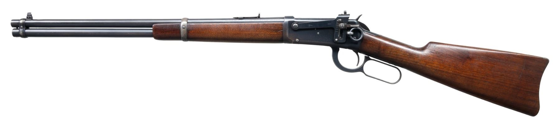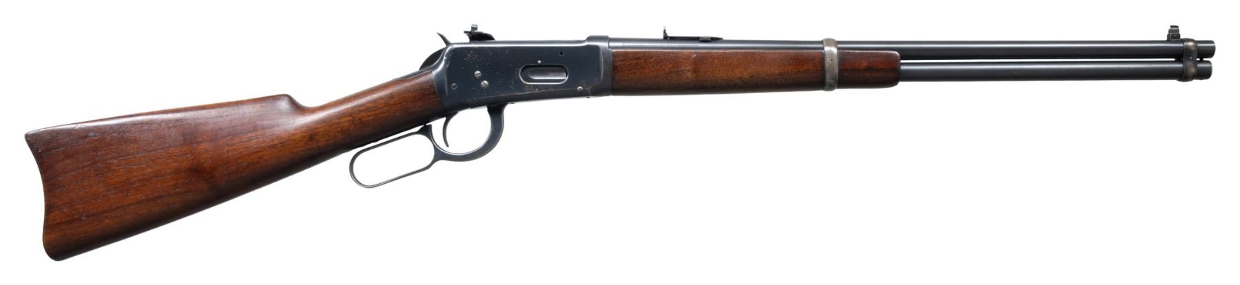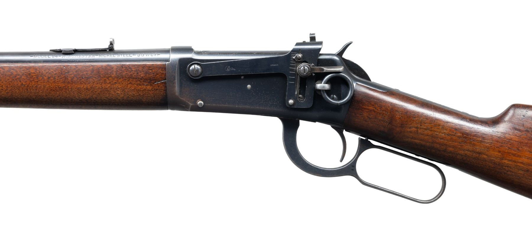 RING CARBINE. Cal. 30 WCF (30-30). S# 1029745. Bbl. 20". Model 94 lever action saddle ring carbine mfg. by Winchester in 1928. Left side of the bbl. is marked with the model and cal. designations, with Winchester's mfg. information marked on the right. Underside of receiver is stamped with a "7" within a diamond, just forward of the trigger. Metal components exhibit a blue finish overall. Plain wood straight grip buttstock with carbine buttplate and plain wood forend. Pinned brass tipped Marbles Sheard No. 6 blade front sight, with dovetailed U-notch flip-up rear sight, and "Climbin Lyman" receiver mounted aperture rear sight. Full length mag., with saddle ring mounted on left side of receiver. CONDITION: metal components retain the majority of their original factory blue finish, showing areas of wear and thinning that is fading to gray and brown patinas, scattered superficial handling marks, as well as scattered spots/areas of light to mild surface level pitting, primarily on the receiver and lever. Mirror bore, retaining well defined rifling throughout. Proper manual mechanics. Wood furniture shows scattered marks and impressions from handling and storage, but otherwise remains sturdy and serviceable. PROVENANCE: The Esteemed Norm Greenberg Collection. (25-4206/MLW). CURIO. $700-1,100.