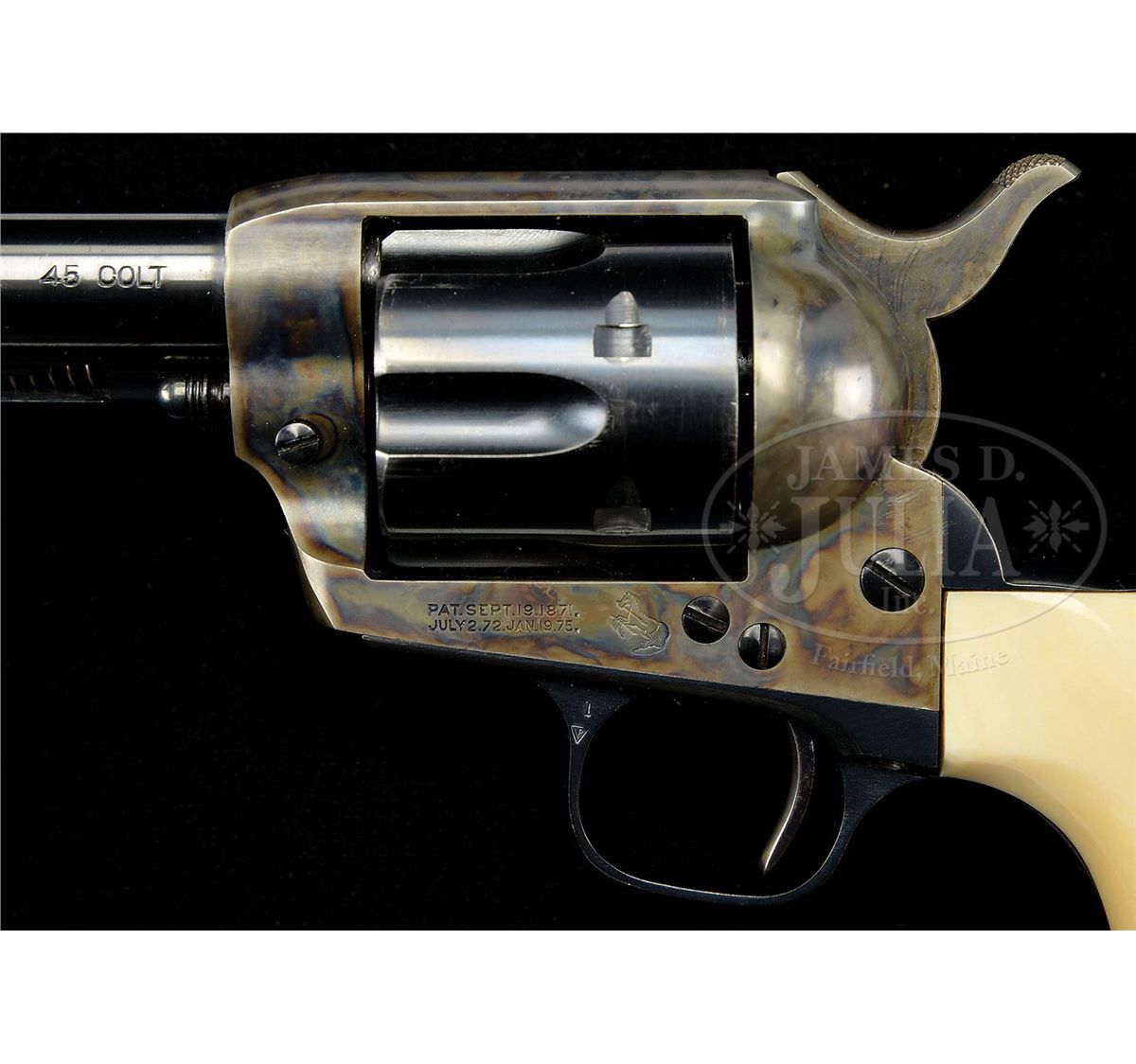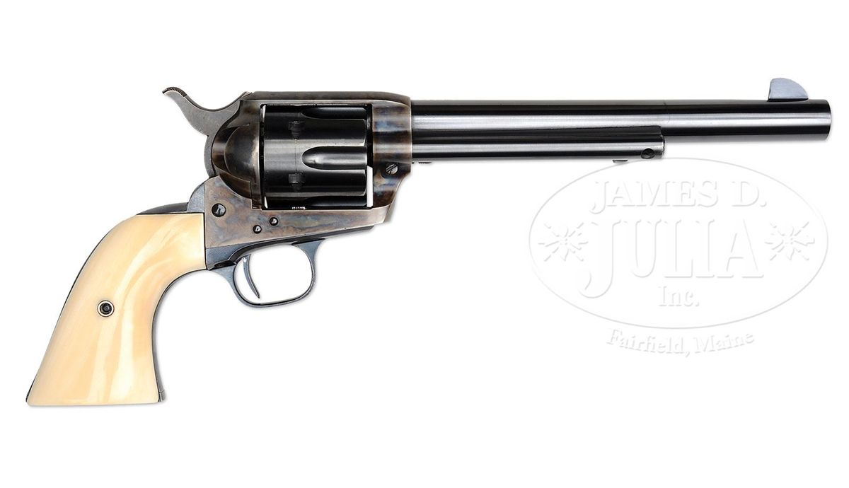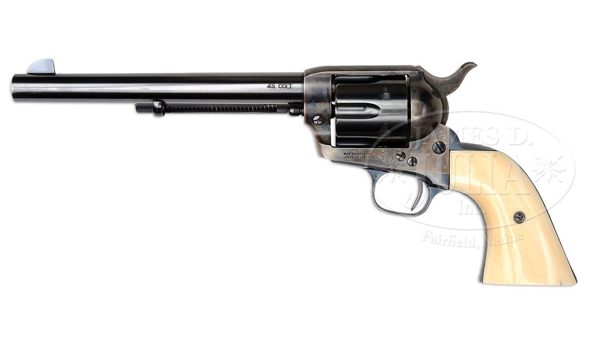 SN 353011. Cal. 45 Colt. Blue & color case hardened with 7-1/2" bbl, orig thick front sight, 1-line block letter address and caliber marking on left side. Left side of frame has 2-line, 3-patent dates and a rampant Colt. Mounted with replacement smooth ivory grips that are pencil numbered on inside to this revolver along with a $7.00 price marking, which indicates that they were purchased about contemporary with revolver. The full serial number was observed on the right side of the front & back straps under the grip and the last two digits of SN are stamped on rear face of cylinder. CONDITION: Extremely fine plus. Bbl & cyl retain 98-99% glossy orig factory blue with only slight sharp edge wear and a faint cyl drag line; frame & hammer retain about all of their orig factory case colors, brilliant in sheltered areas, lightly to moderately faded elsewhere; grip frame has a few very minor nicks with some minor sharp edge wear. Grips are solid & sound with a couple of age lines and retain a wonderful mellow ivory patina. Mechanics are crisp, brilliant shiny bore. 4-48803