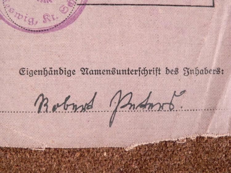 PRE-WWII 1933-"FUHRERSCHEIN--LEADER IDENTIFICATION/TRANSITIONAL GOVT LEADER/PHOTO * THIS ALSO IS FOR ROBERT PETERS--ID PAPERSFROM 1933-LARGE PHOTO OF HIM AND TRIPLE STAMPED WITH TRANSITIONAL EAGLE WITH SWASTIKA ON CHEST-GOVT RUN IN 1933 BY VON HINDENBURG & HITLER-OILCLOTH--WENT ON TO BE A LEADER IN ORG TODT