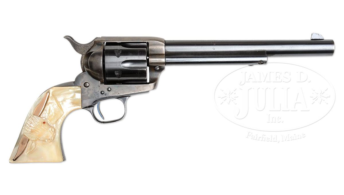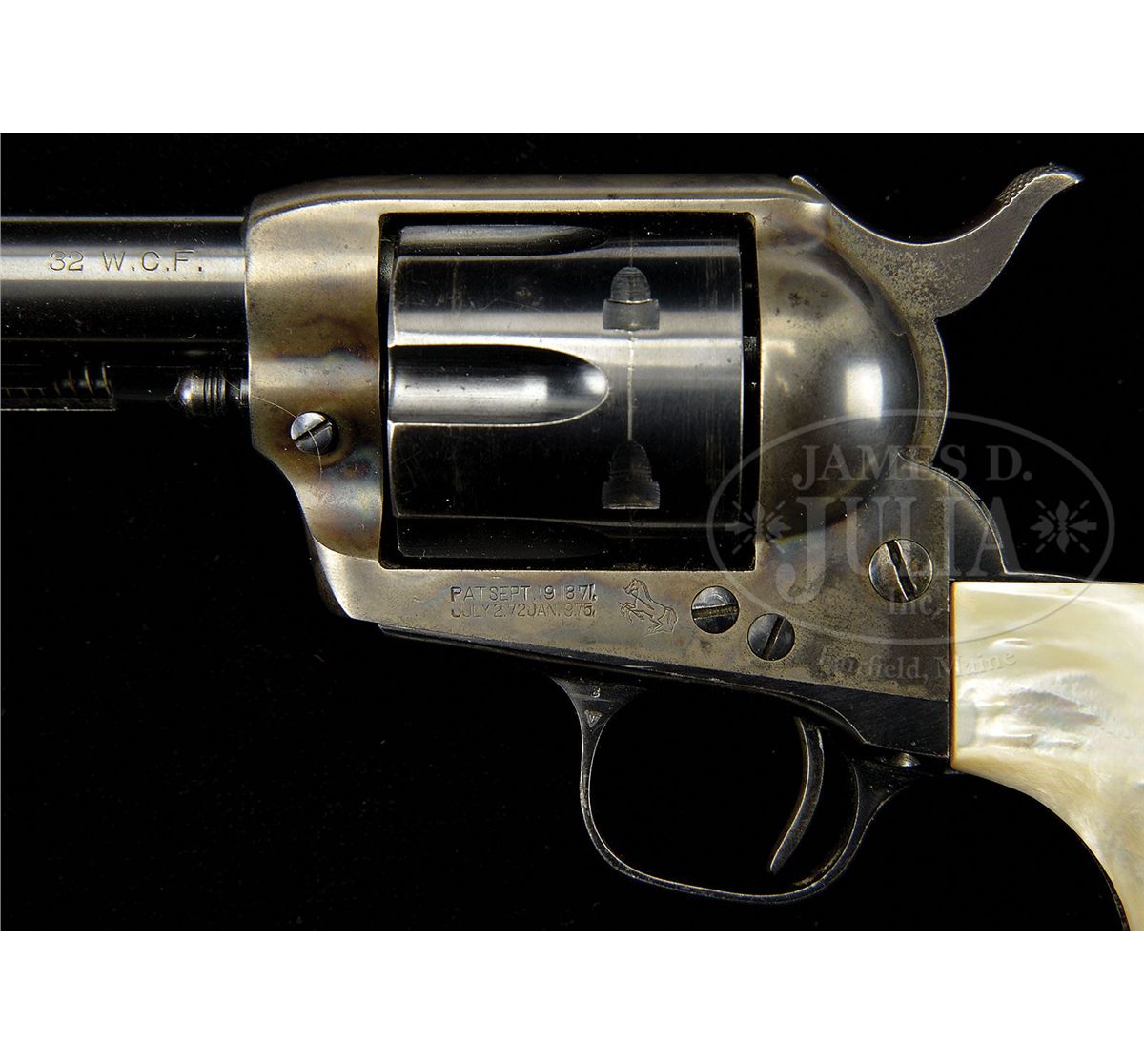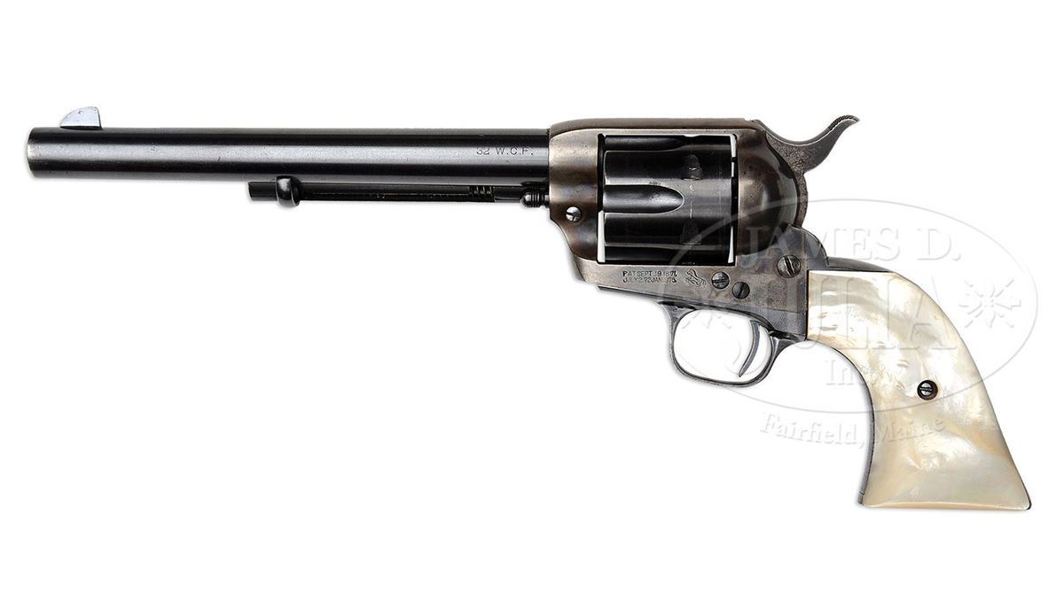 SN 346213. Cal. 32 WCF (32-20). Blue & color case hardened with 7-1/2" bbl, slightly reduced front sight and 1-line block letter address with caliber marking on left side. Left side of frame has 2-line, 3-patent dates and rampant Colt. Mounted with 2-pc pearl grips that have a raised carved ox head with gold covered horns on right side. It also has one red stone in its left eye with its right side stone missing. Accompanied by what is probably its orig rampant Colt hard rubber grips. Right side of front & backstraps, under the grip, have matching SN and rear face of cyl has last two digits of matching SN. CONDITION: Very fine. Bbl & ejector housing retain 96-97% crisp orig blue with some light muzzle edge & front end wear; frame retains bright case colors in sheltered areas, faded elsewhere; hammer retains faded case colors; trigger guard & backstrap retain most of their orig blue turned plum on front & backstraps; cyl retains about 95% orig blue. Pearl grips are a little large, are sound and show great fire & color; hard rubber grips are also sound with one small nick and light diamond point wear. Mechanics are crisp, bright shiny bore. 4-48773 JR327