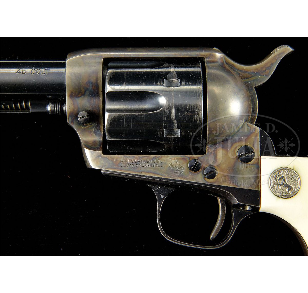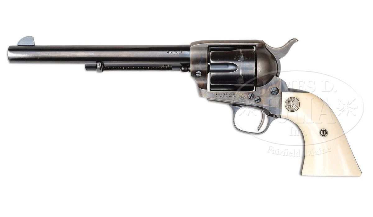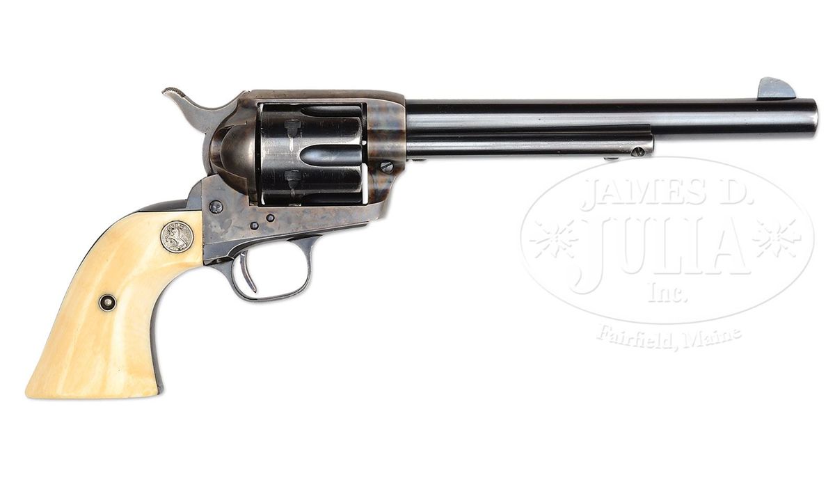 SN 351163. Cal. 45 Colt. Blue & color case hardened with 7-1/2" bbl, full front sight and block letter address with caliber marking on left side. Left side of frame has 2-line, 3-patent dates and rampant Colt. Right side of front & backstraps, under the grip, are marked with the matching SNs and rear face of cyl has last two digits of matching SN. Mounted with 2-pc silver medallion, smooth ivory grips that are orig to this revolver. This revolver will letter in caliber 45 with 7-1/2" bbl, blue finish and rubber grips, shipped Jan. 30, 1928 to Piper & Taft, Seattle, WA in a 1-gun shipment. Remarks section states that the special order number was 14134/1 and also included one pair of ivory stocks which are installed on this revolver. CONDITION: Very fine, all matching except grips which are unnumbered. Bbl & ejector housing retain about 95% glossy orig blue showing holster wear on left side of bbl & tip of ejector housing; frame & hammer retain most of their orig case colors, brilliant in the most sheltered areas, strong elsewhere, faded on the left recoil shield and top edge of hammer; cyl retains about 90% orig blue, strong in the flutes showing wear on front & rear edges with a drag line and light thinning; trigger guard retains strong orig blue with the front strap a blue/gray patina; backstrap & buttstrap retain most of their strong orig blue. Grips are sound and retain a fine ivory patina. Mechanics are crisp, brilliant shiny bore. 4-48785 JR347