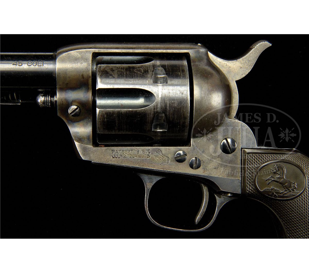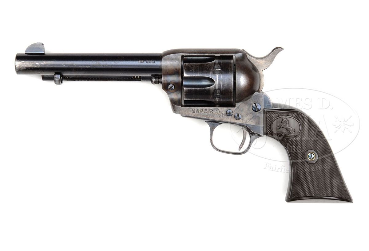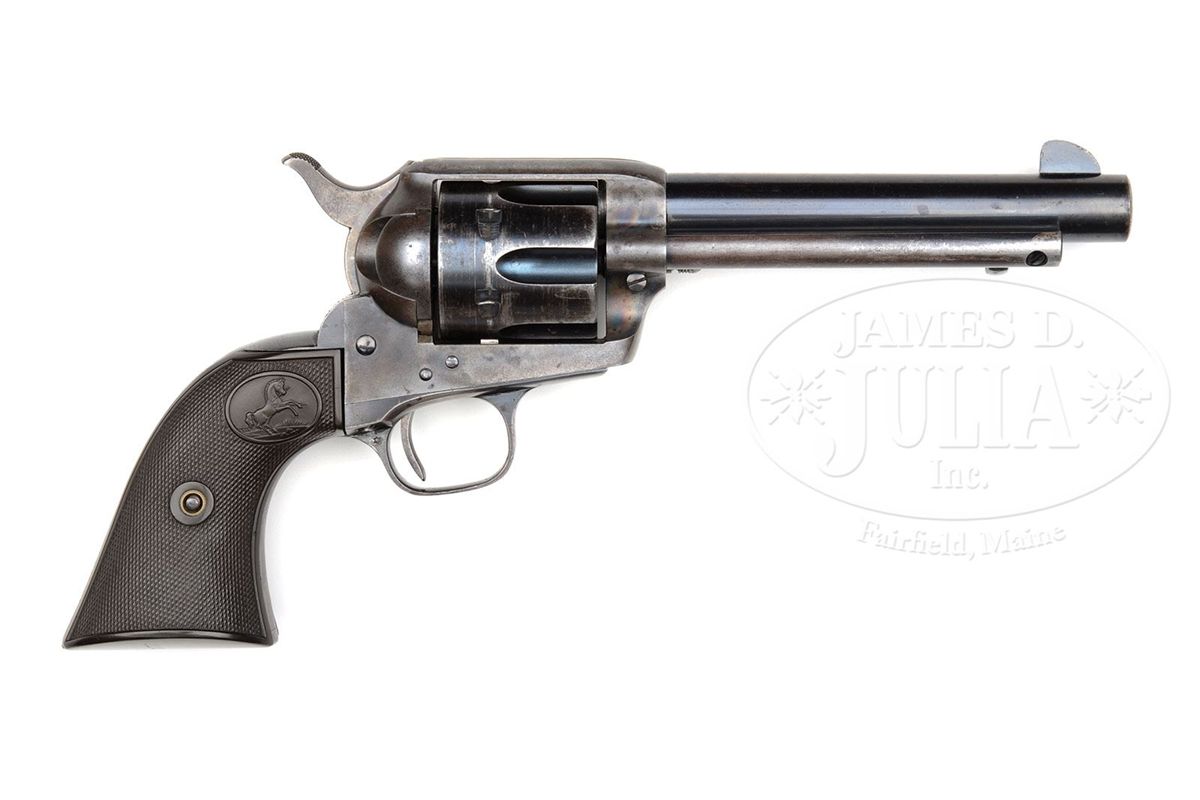 SN 342638. Cal. 45 Colt. Blue & color case hardened with 5-1/2" bbl, full thick front sight and 1-line block letter address with caliber marking on left side. Left side of frame has 2-line, 3-patent dates and rampant Colt. Mounted with rampant Colt hard rubber grips. Left side of front & backstraps are marked with matching SNs to this revolver and rear face of cyl has last two digits of matching SN. CONDITION: Fine, all matching except grips which are unnumbered. Bbl retains about 90% strong orig blue with wear on left side of muzzle and thinning on left side of bbl; ejector housing retains bright blue in gullets with outer radius a blue/gray patina; frame retains very strong, bright case colors in sheltered areas with the balance faded to a silver/gray patina; hammer retains strong case colors; cyl retains bright blue in flutes, thin on outer diameter with wear on front & rear edges; trigger guard & backstrap retain blue in sheltered areas with the frontstrap a plummy/blue patina and the backstrap strong blue with fine flaking. Grips are sound showing light to moderate diamond point wear, beginning to turn chocolate. Screws retain most of their fire blue. Hammer is not solid in safety notch, otherwise mechanics are fine, brilliant shiny bore. 4-48783 JR343