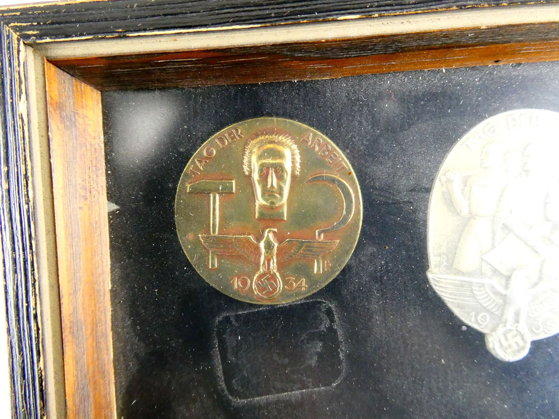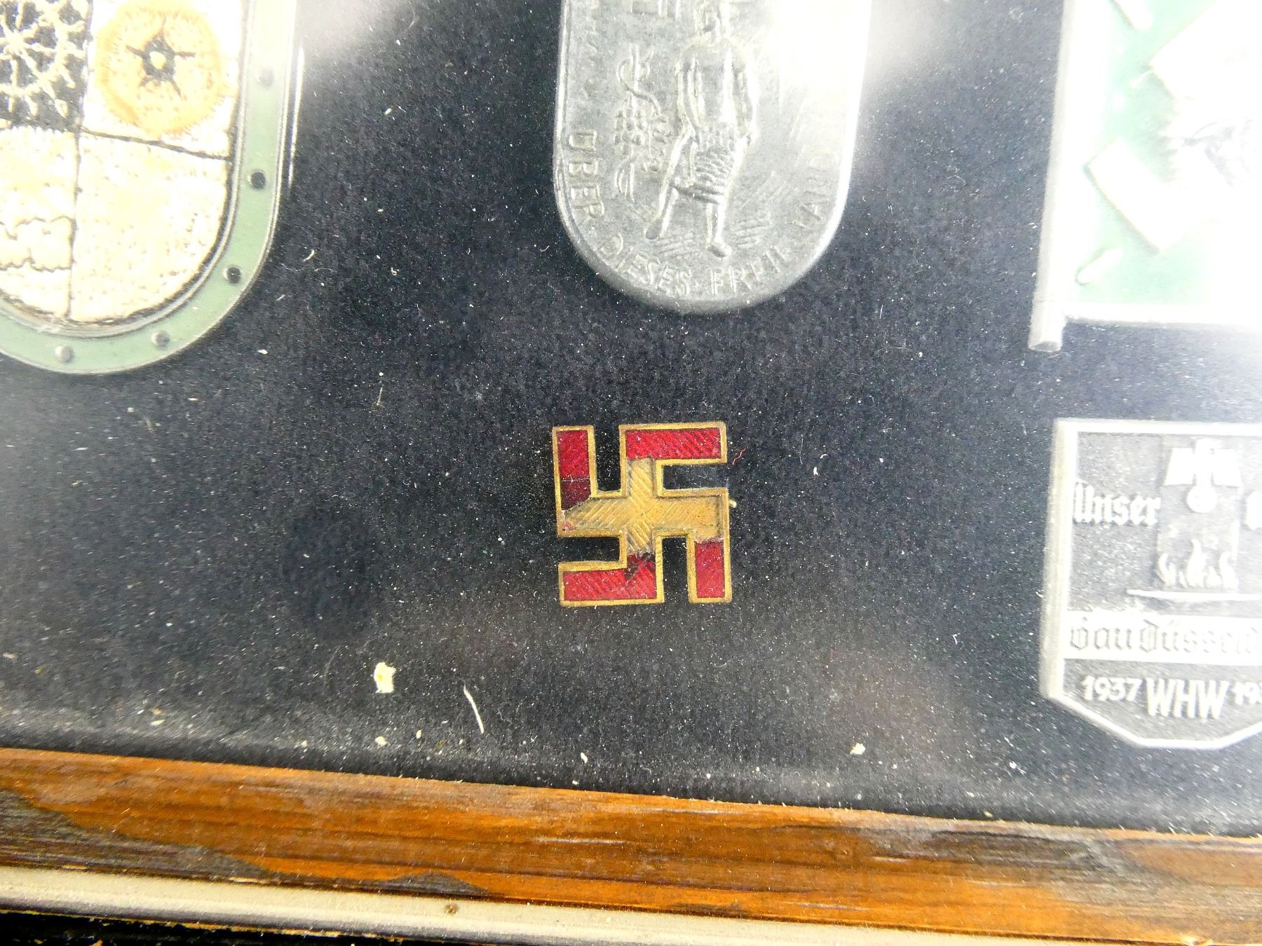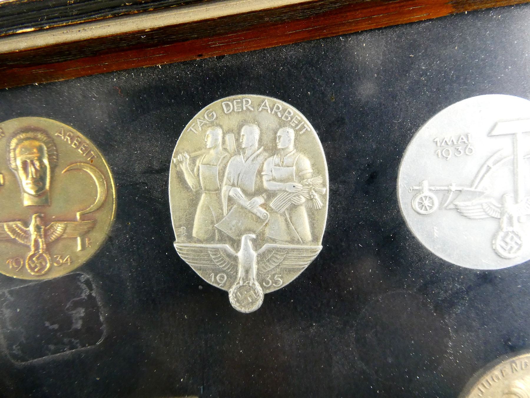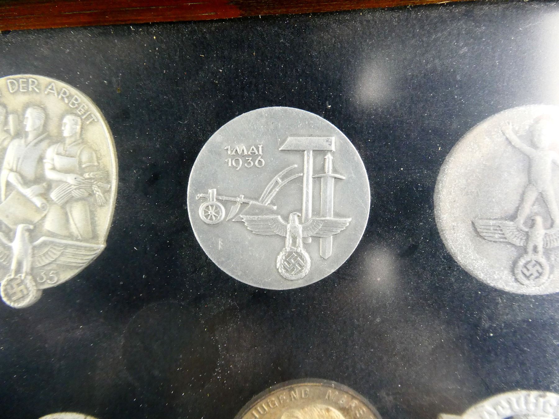 APPROX. (19) TINNIES, RALLY BADGES, COIN, ETC., VARIOUS MATERIALS / SIZES / COLOURES, UNDER GLASS, INCLUDES; HITLER YOUTH COIN DATED 1933, "TAG DER ARBEIT, 1934" RALLY BADGE, "TAG DER ARBEIT, 1935" RALLY BADGE, "1MAI, 1936" RALLY BADGE, "DEUTSCHES, JUGENDFEST 1937" RALLY BADGE, SWASTIKA BADGES, ETC. & (1) FRAME, WOOD / GLASS CONSTRUCTION, WOOD BACKING NAILED IN PLACE, APPROX. 11" X 9 1/8" X 1 3/8". SEE PHOTOS. *NO GUARANTEE ON GLASS FOR SHIPPING*