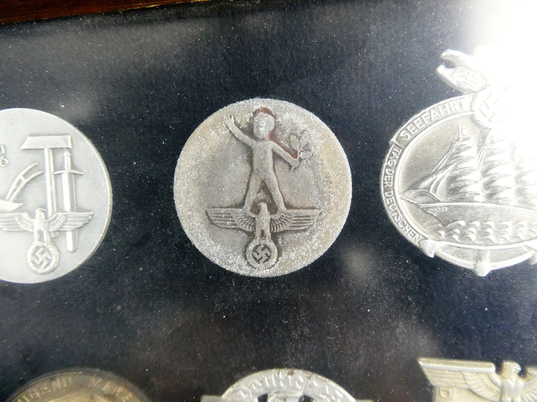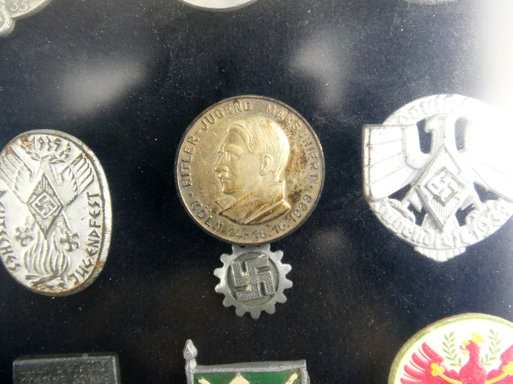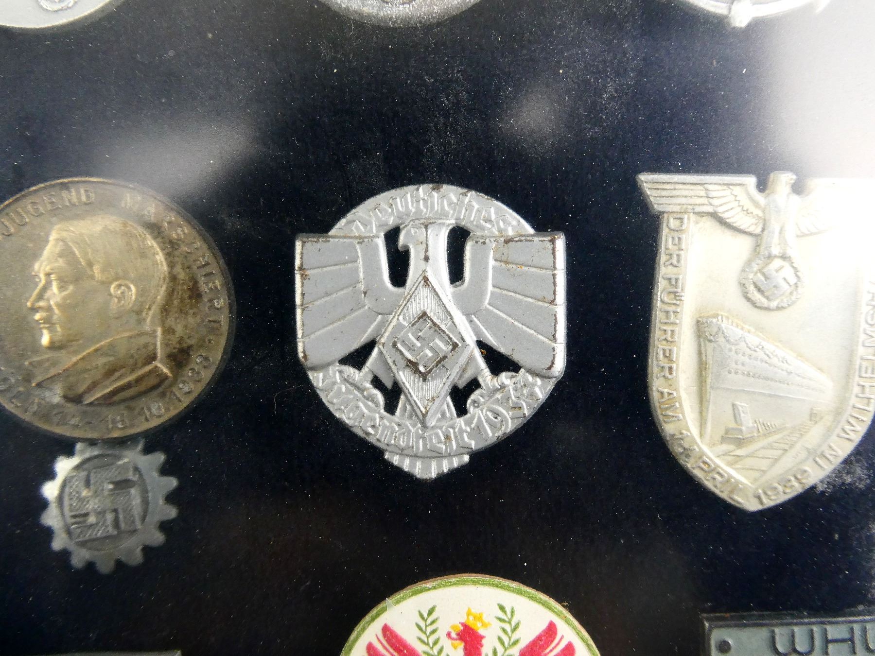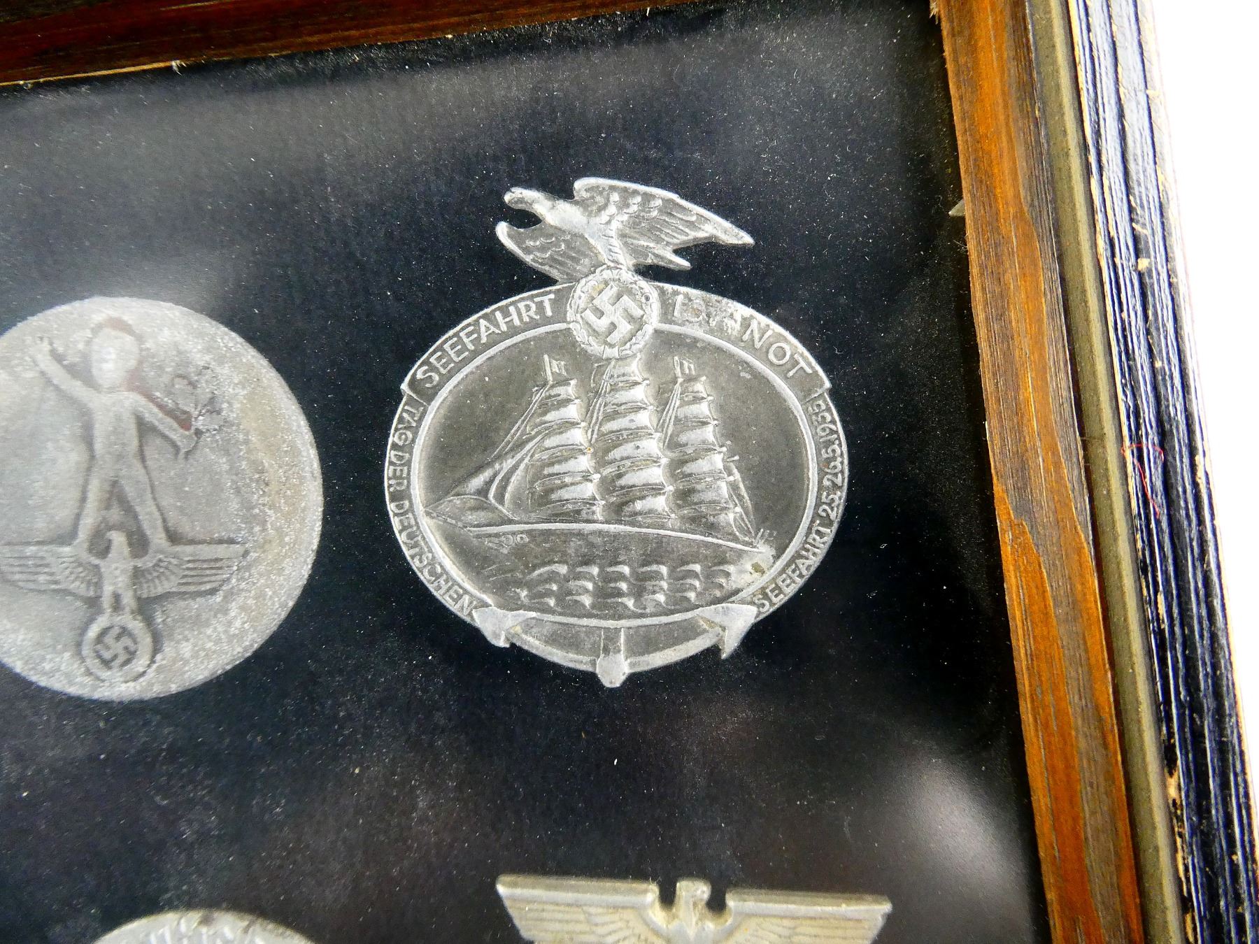 APPROX. (19) TINNIES, RALLY BADGES, COIN, ETC., VARIOUS MATERIALS / SIZES / COLOURES, UNDER GLASS, INCLUDES; HITLER YOUTH COIN DATED 1933, "TAG DER ARBEIT, 1934" RALLY BADGE, "TAG DER ARBEIT, 1935" RALLY BADGE, "1MAI, 1936" RALLY BADGE, "DEUTSCHES, JUGENDFEST 1937" RALLY BADGE, SWASTIKA BADGES, ETC. & (1) FRAME, WOOD / GLASS CONSTRUCTION, WOOD BACKING NAILED IN PLACE, APPROX. 11" X 9 1/8" X 1 3/8". SEE PHOTOS. *NO GUARANTEE ON GLASS FOR SHIPPING*