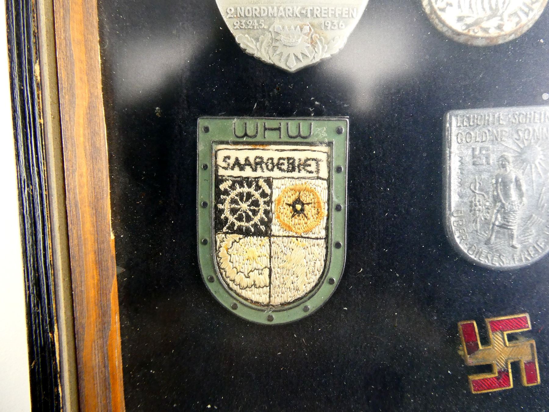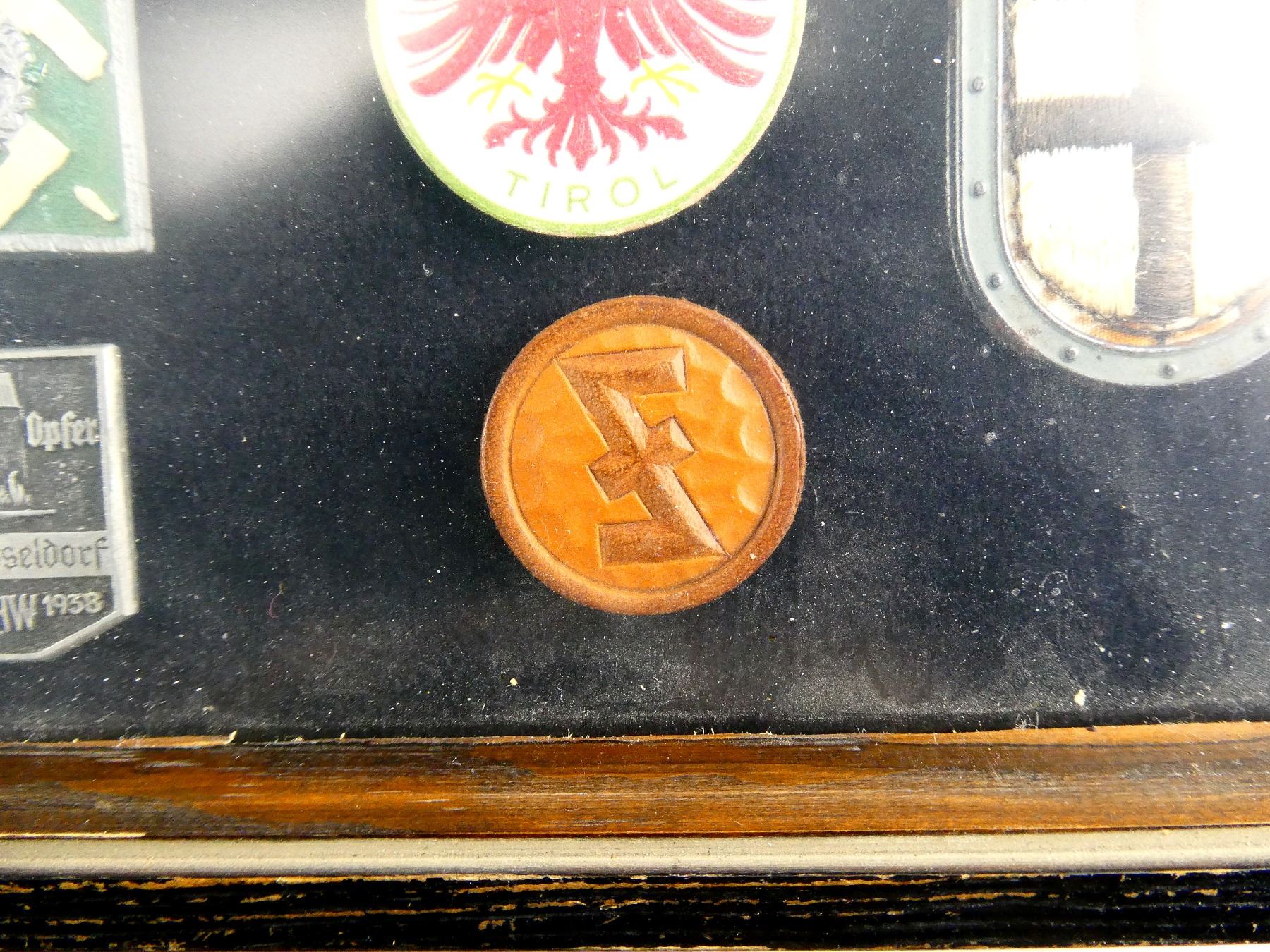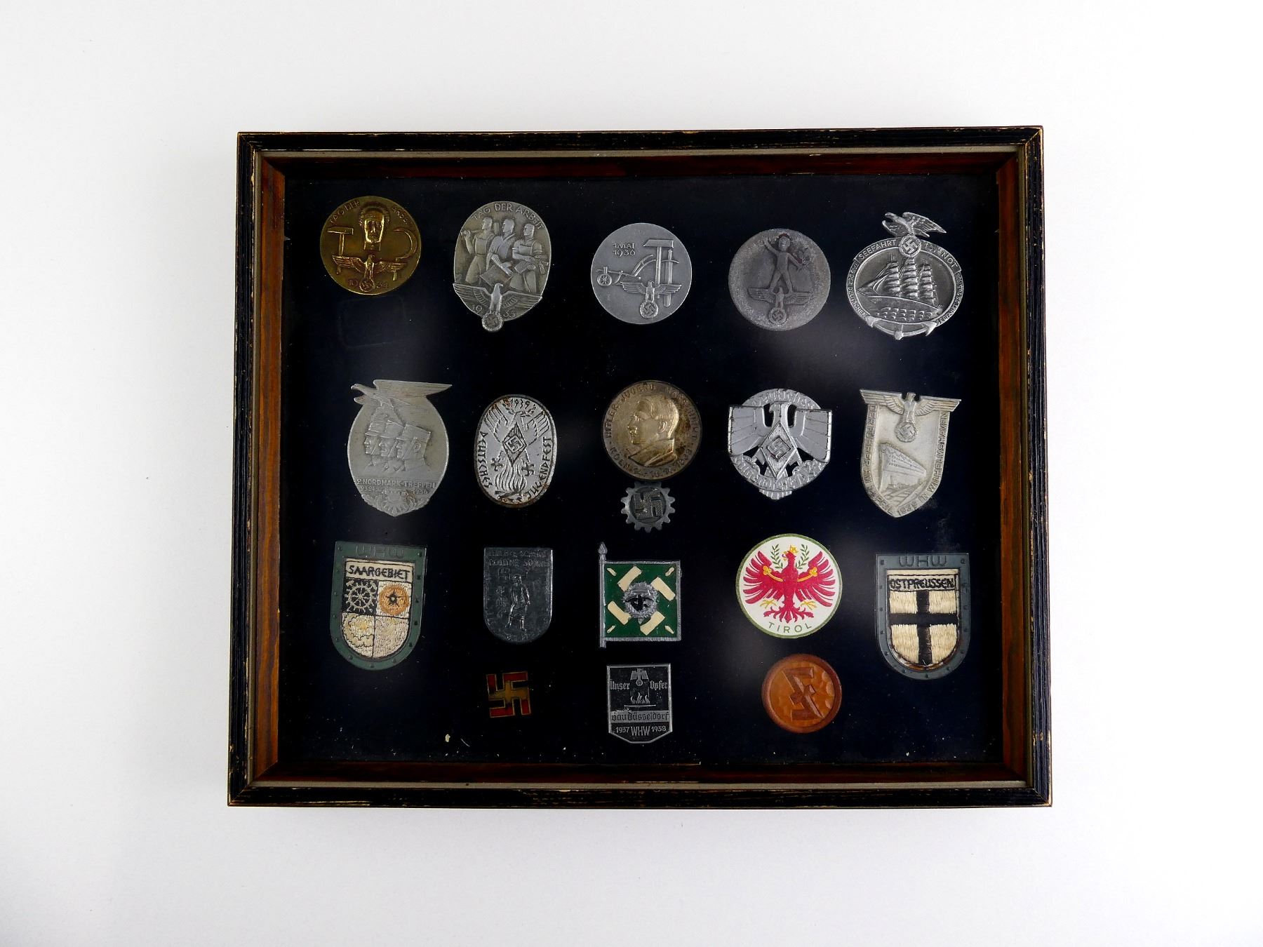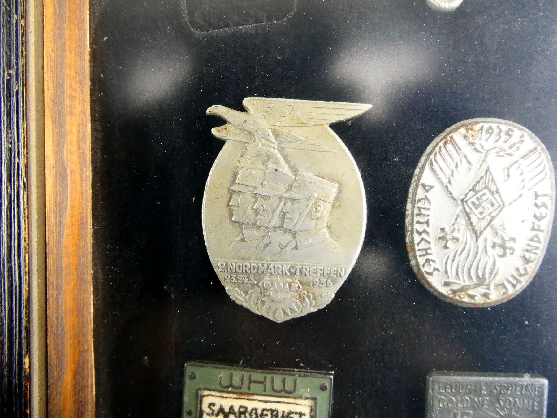 APPROX. (19) TINNIES, RALLY BADGES, COIN, ETC., VARIOUS MATERIALS / SIZES / COLOURES, UNDER GLASS, INCLUDES; HITLER YOUTH COIN DATED 1933, "TAG DER ARBEIT, 1934" RALLY BADGE, "TAG DER ARBEIT, 1935" RALLY BADGE, "1MAI, 1936" RALLY BADGE, "DEUTSCHES, JUGENDFEST 1937" RALLY BADGE, SWASTIKA BADGES, ETC. & (1) FRAME, WOOD / GLASS CONSTRUCTION, WOOD BACKING NAILED IN PLACE, APPROX. 11" X 9 1/8" X 1 3/8". SEE PHOTOS. *NO GUARANTEE ON GLASS FOR SHIPPING*