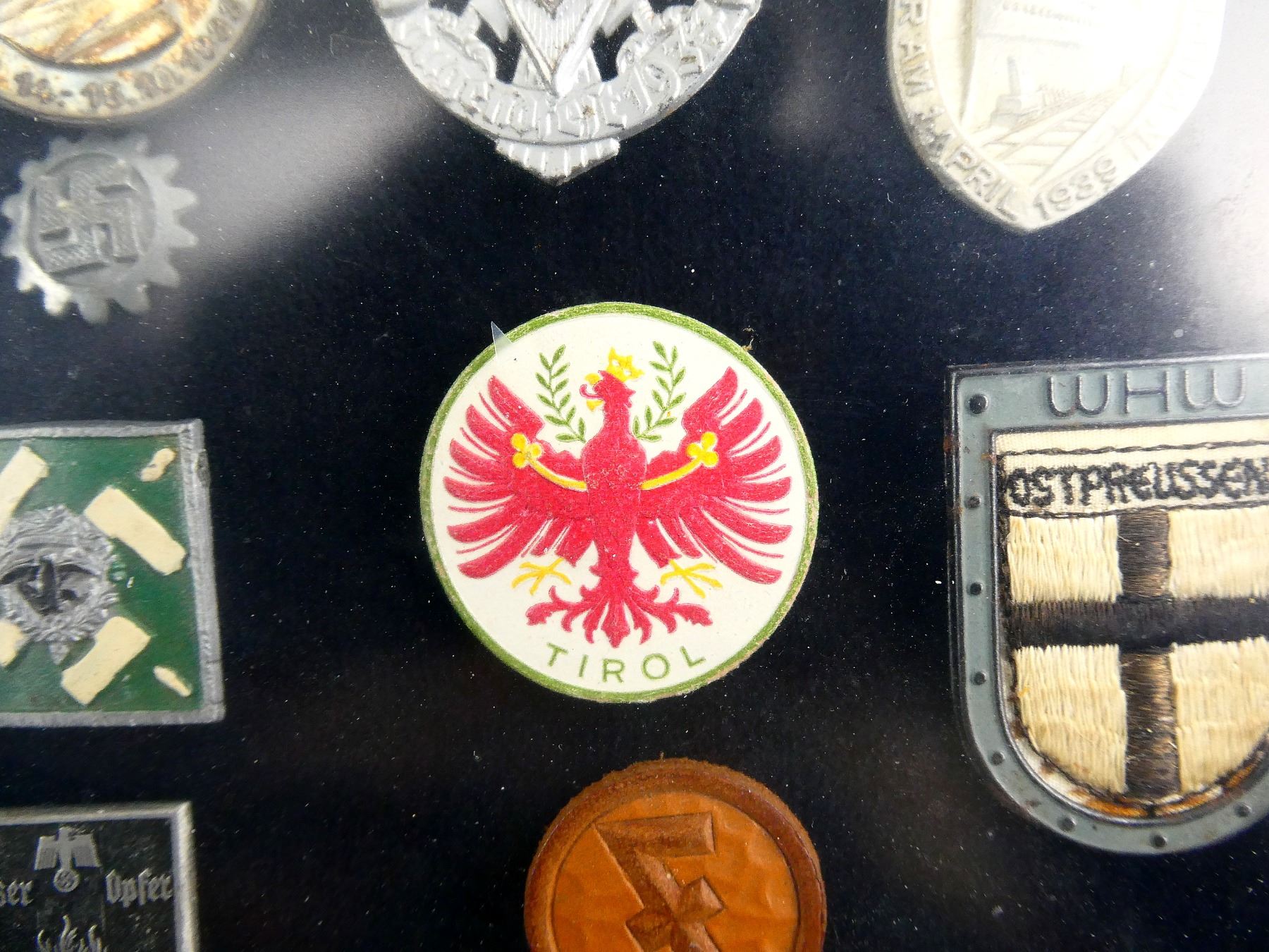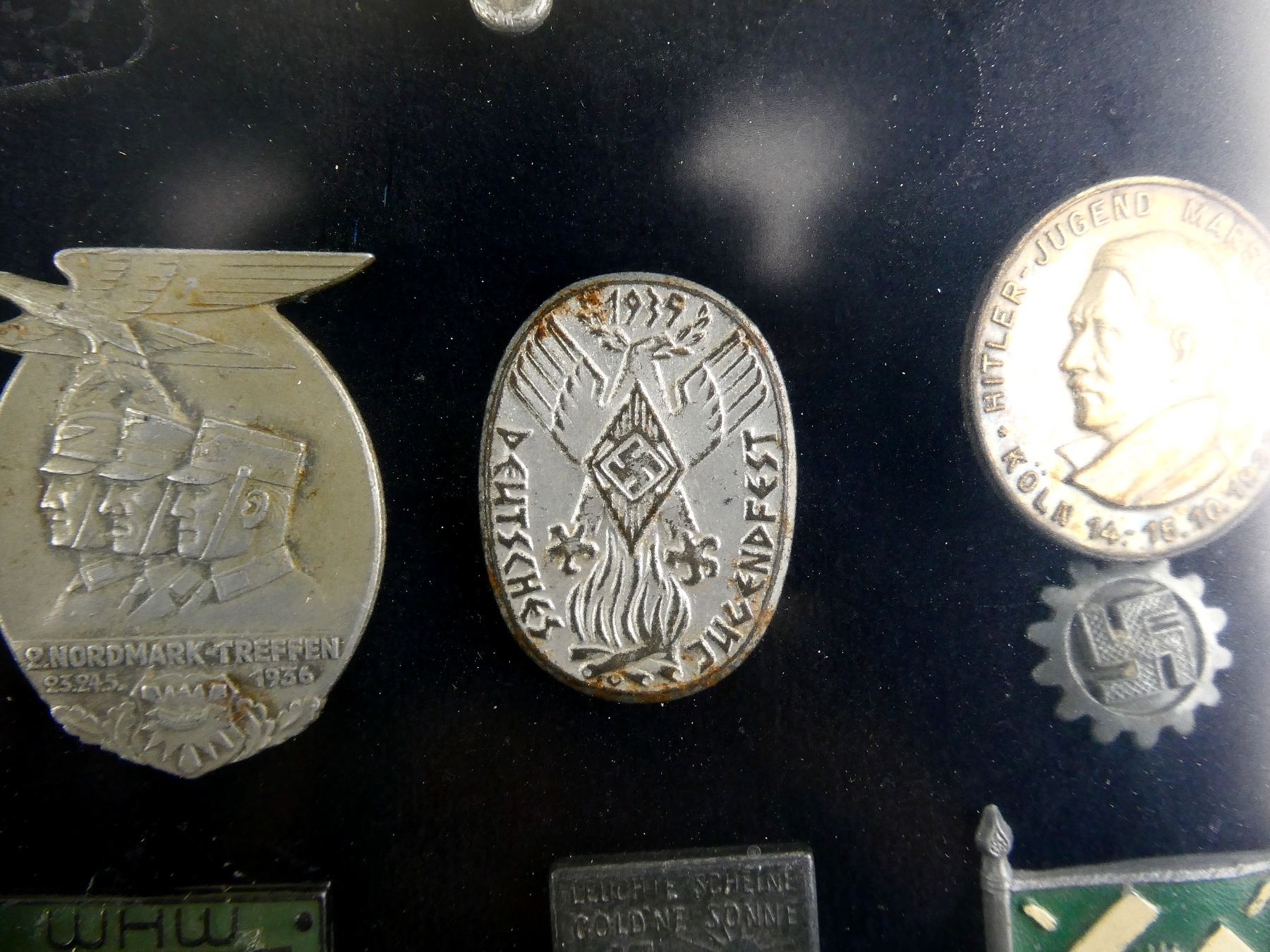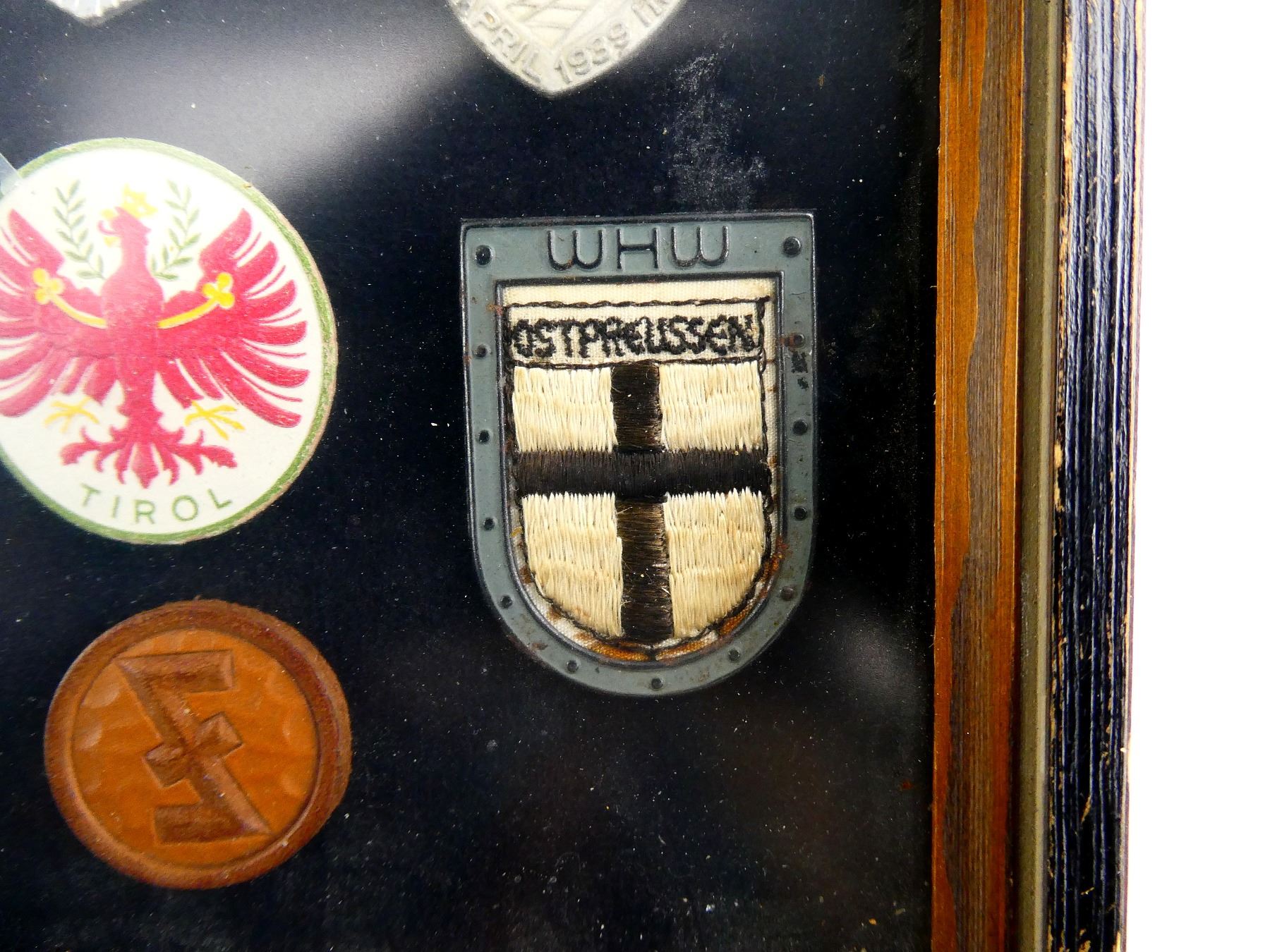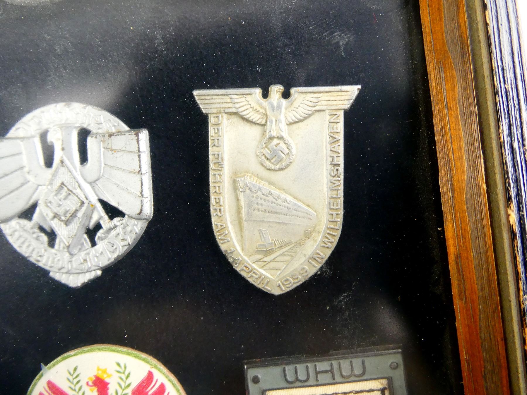 APPROX. (19) TINNIES, RALLY BADGES, COIN, ETC., VARIOUS MATERIALS / SIZES / COLOURES, UNDER GLASS, INCLUDES; HITLER YOUTH COIN DATED 1933, "TAG DER ARBEIT, 1934" RALLY BADGE, "TAG DER ARBEIT, 1935" RALLY BADGE, "1MAI, 1936" RALLY BADGE, "DEUTSCHES, JUGENDFEST 1937" RALLY BADGE, SWASTIKA BADGES, ETC. & (1) FRAME, WOOD / GLASS CONSTRUCTION, WOOD BACKING NAILED IN PLACE, APPROX. 11" X 9 1/8" X 1 3/8". SEE PHOTOS. *NO GUARANTEE ON GLASS FOR SHIPPING*