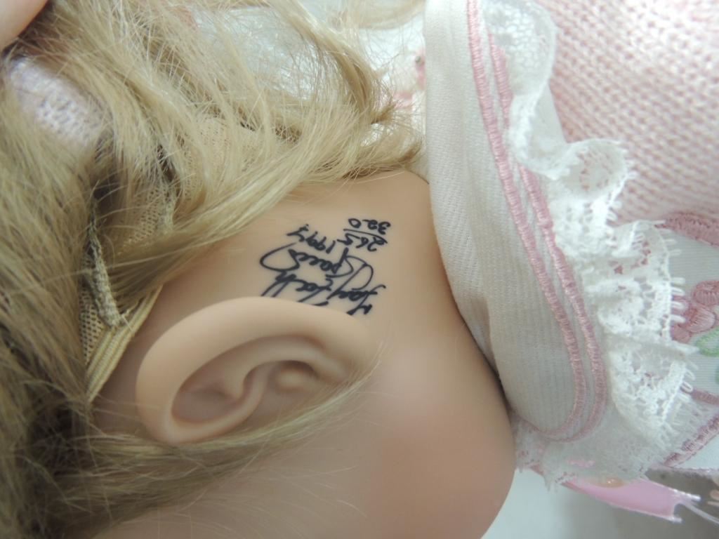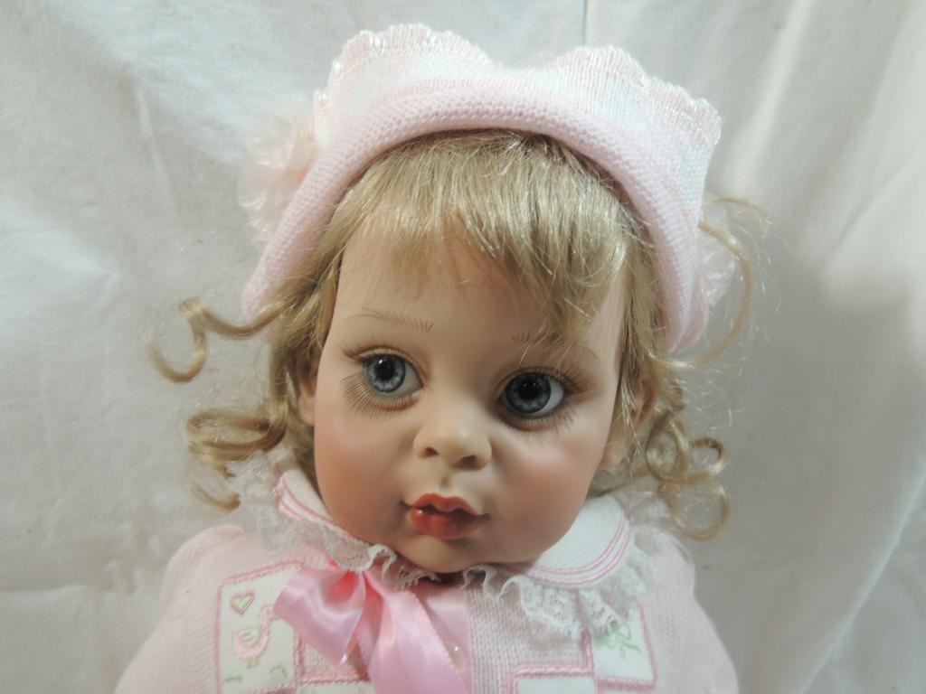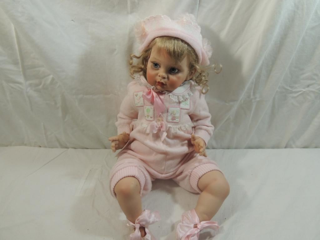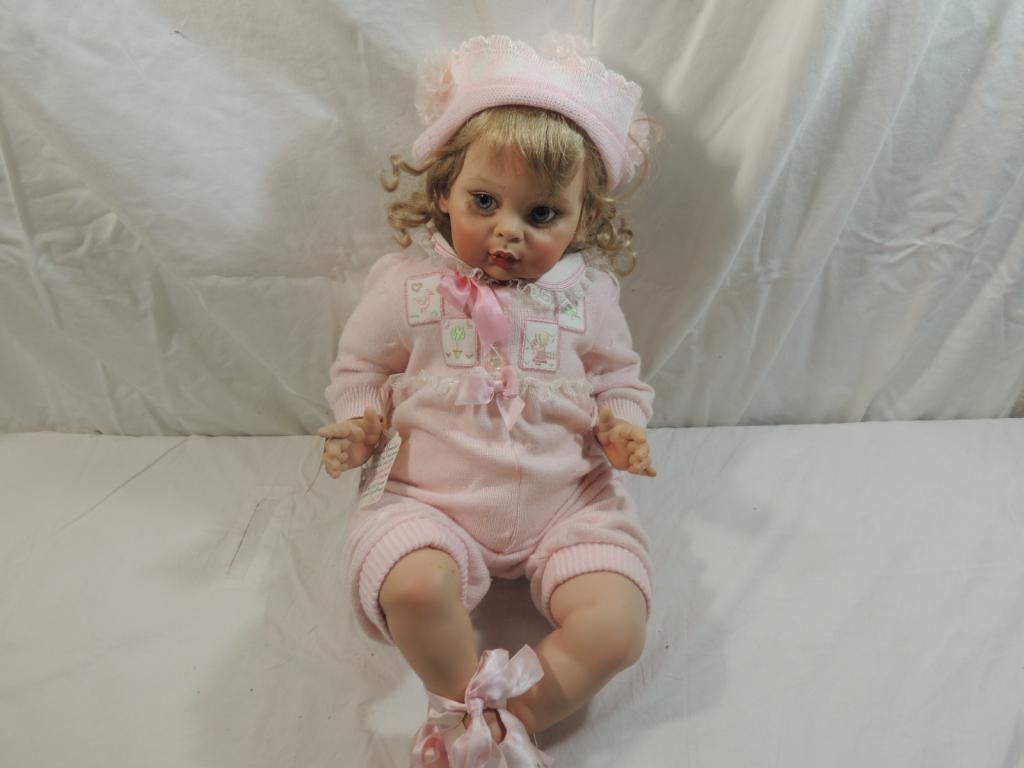 NUMBERED AND SIGNED DOLL, LIMITED EDITION, DESIGNER DOLL, COLLECTORS DOLL, HIGHLY COLLECTIBLE, 265/320 HAND SIGNED, BLONDE HAIR, BLUE EYES, PINK KNIT OUTFIT AS SHOWN SEE PHOTO FOR MORE DETAILS.