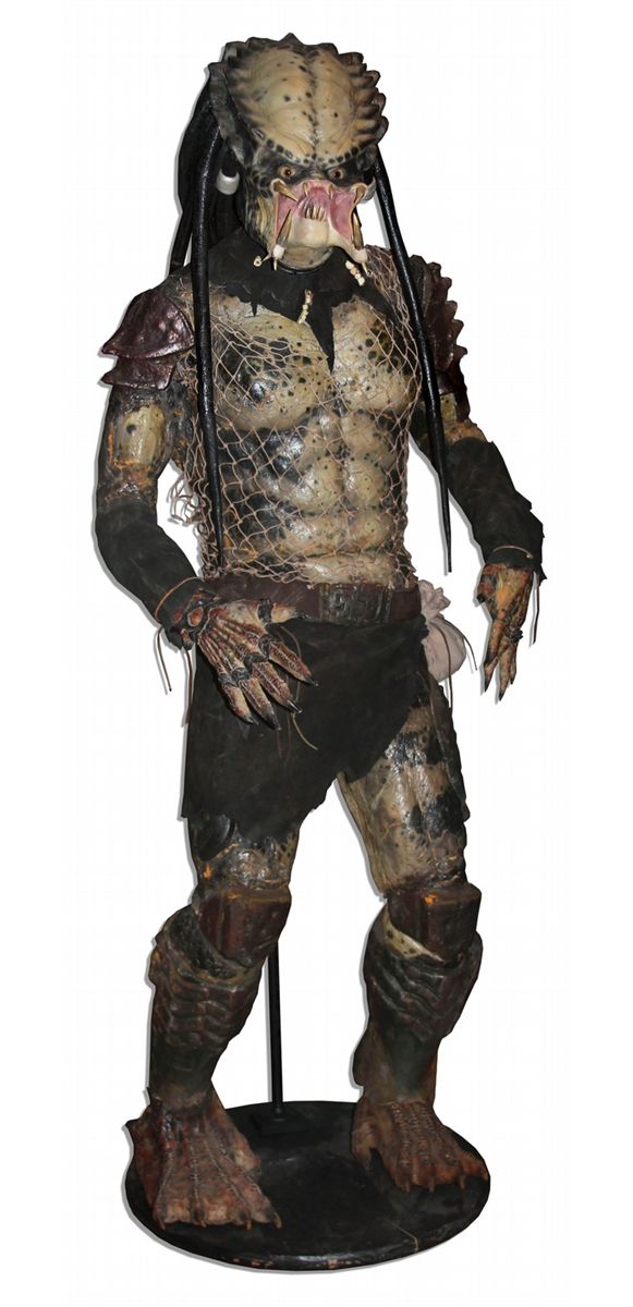 Original screen-used costume ''Hippie Predator'' suit from ''Predator 2'', the 1990 sequel in the successful science fiction action series starring Danny Glover. In the film, Hippie, also known as the Shaman Predator, was a Yautja encountered by Mike Harrigan (Glover) aboard the Yautja Mother Ship hidden beneath Los Angeles in 1997. Suit includes leg and torso crafted of foam latex backed with Spandex, complete with trademark netting with a zipper down the back, plus screen used hands and feet. Replica suede gauntlets, loincloth and head from original molds are professionally mounted on a custom form 74'' inches in height and with a circular base measuring 24'' in diameter. Weighs 63 pounds.