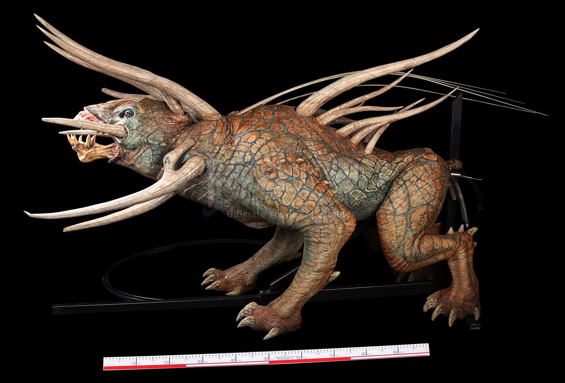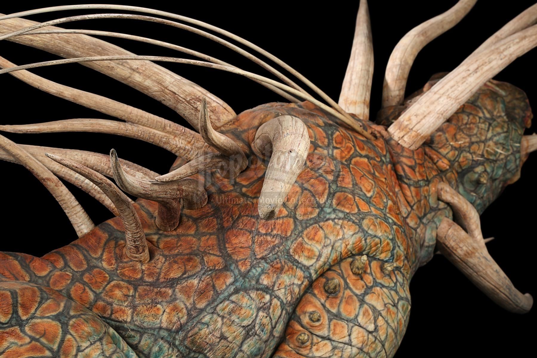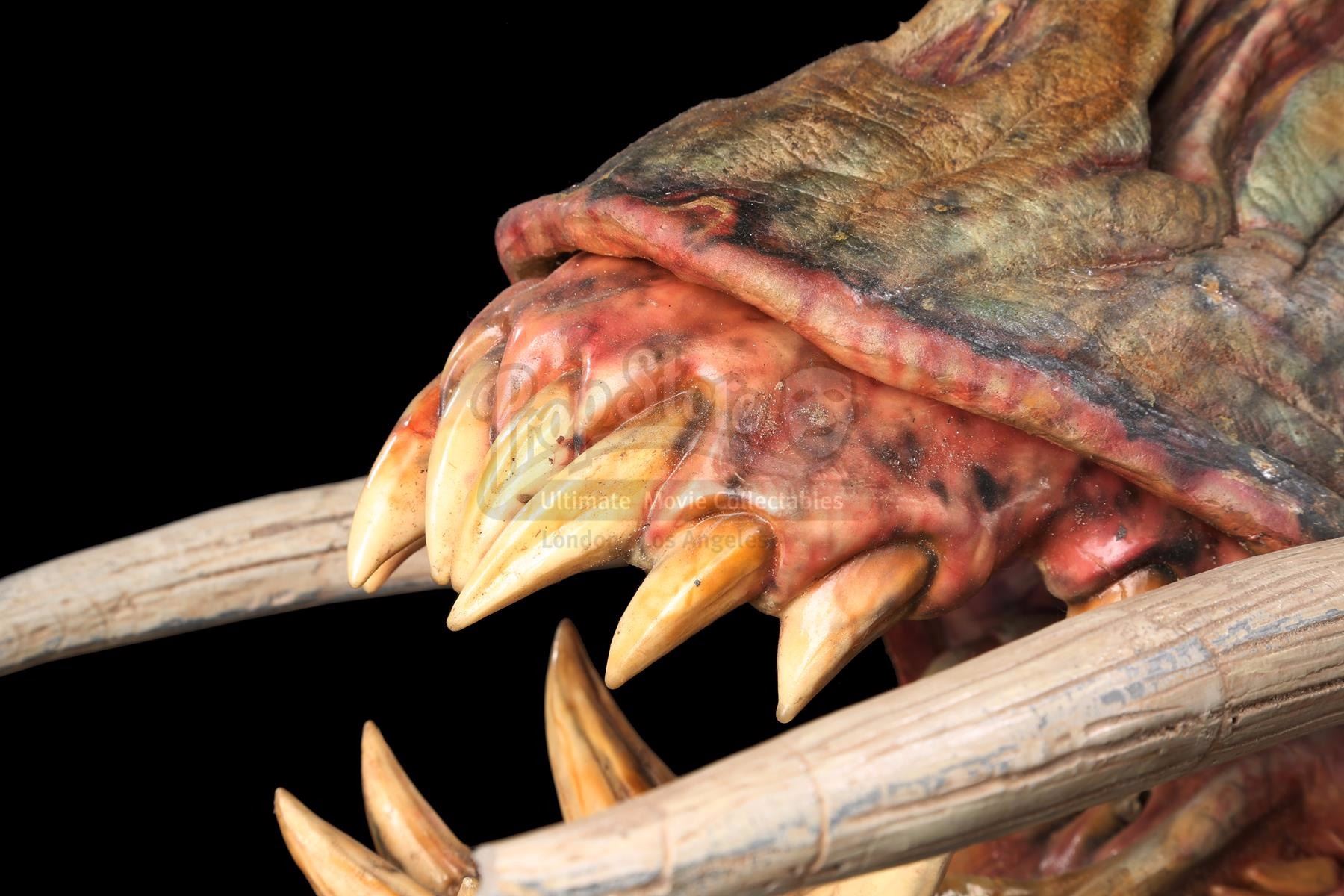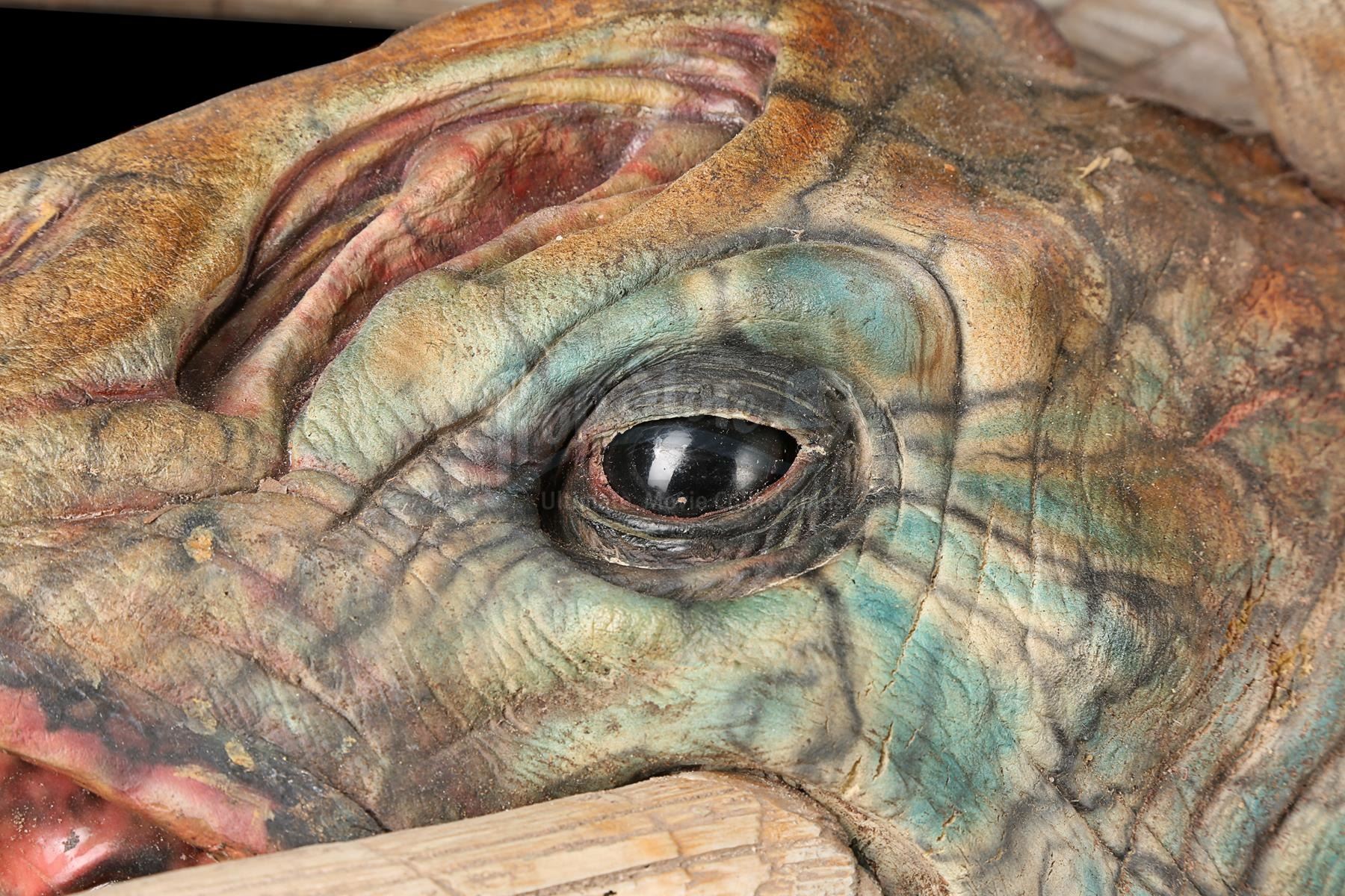 Protruding from the rear is an assortment of cables to control the movement, as well as the clear plastic tubing the drool was piped through. The puppet is held in position on a large, custom-made metal stand, which is inserted through its rear. It remains in very good condition, with some minor cracks and tears in the main joints. Dimensions: 185 cm x 80 cm x 90 cm (73'' x 32'' x 35'')