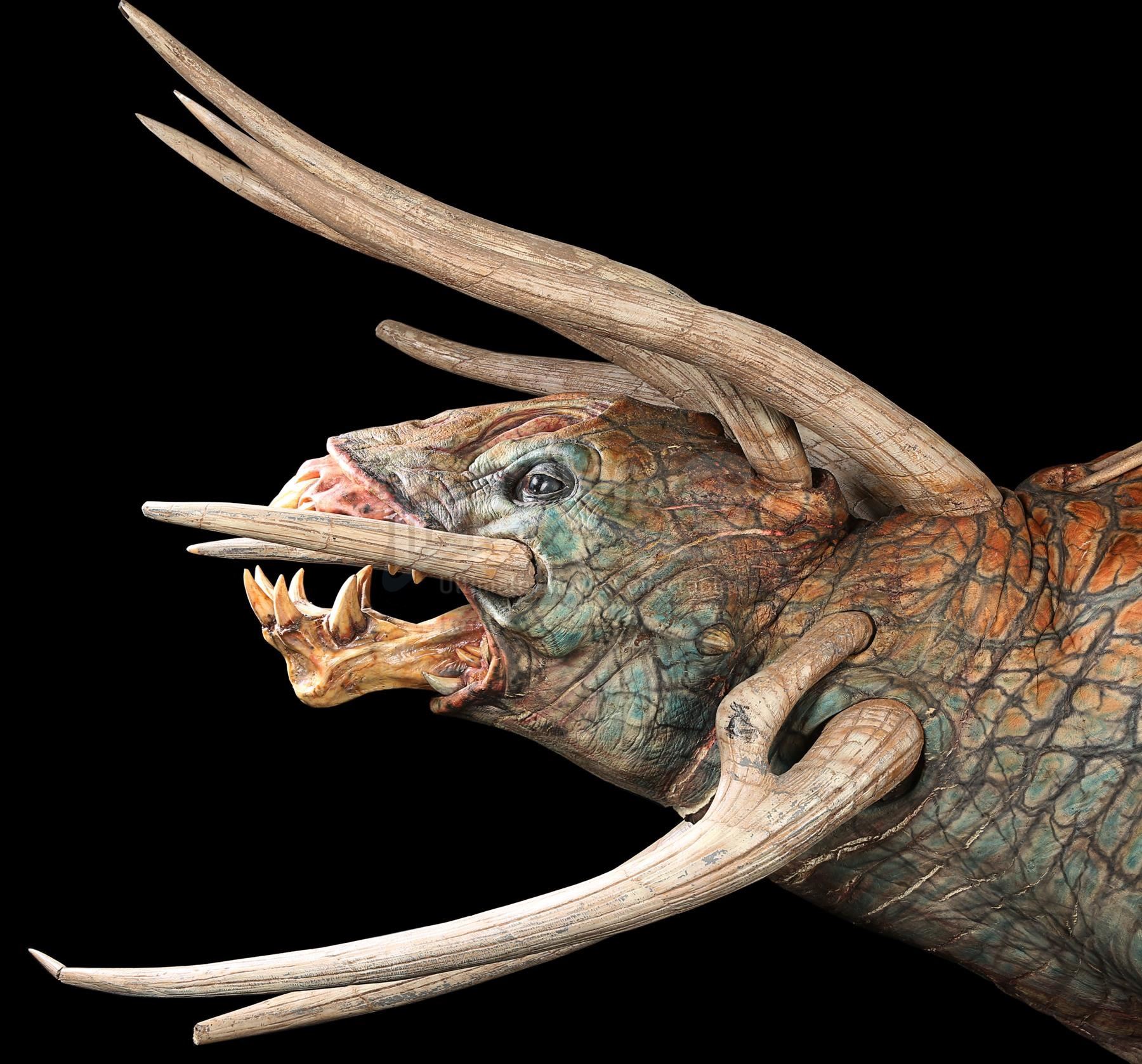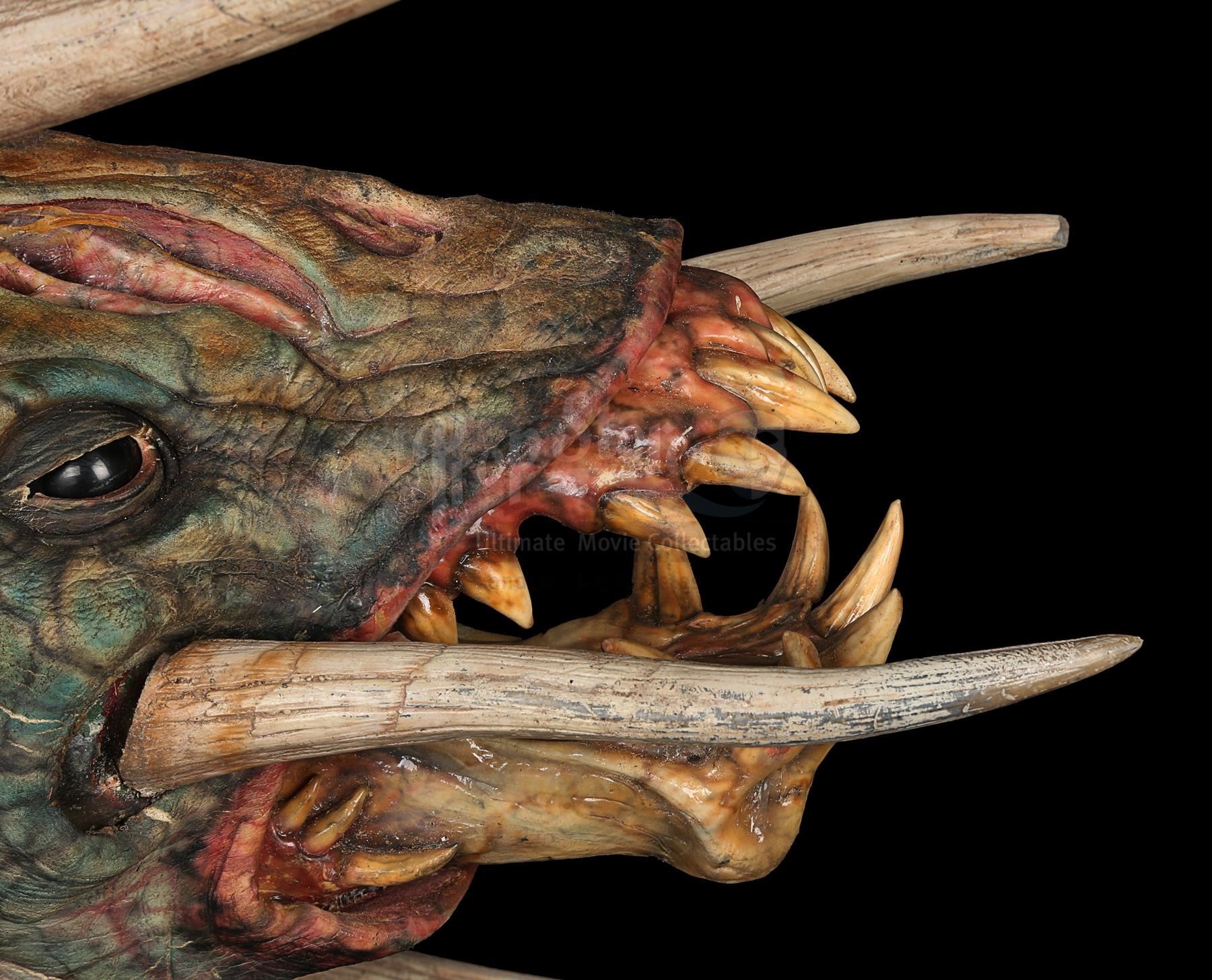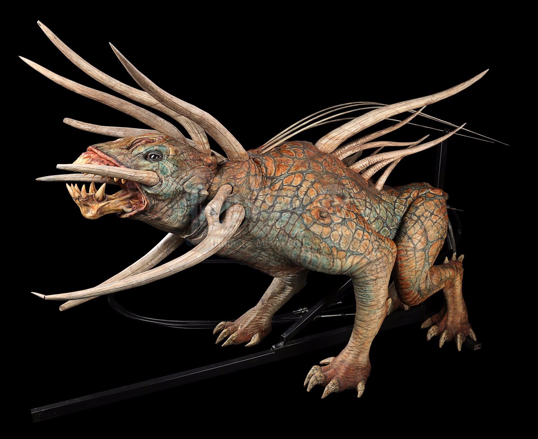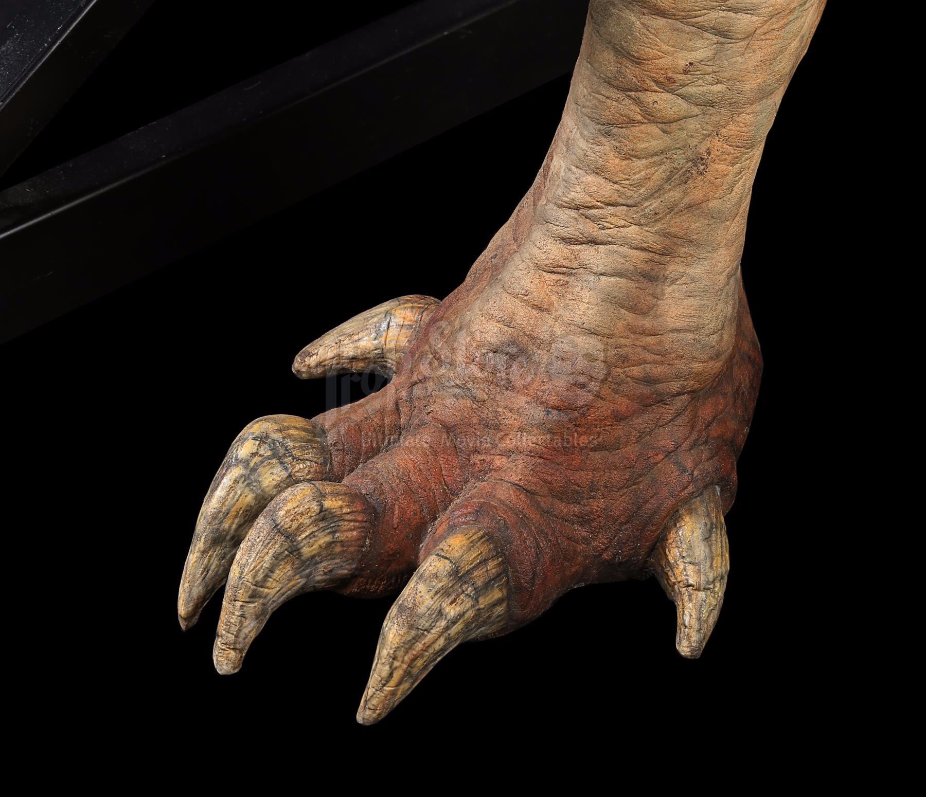 Protruding from the rear is an assortment of cables to control the movement, as well as the clear plastic tubing the drool was piped through. The puppet is held in position on a large, custom-made metal stand, which is inserted through its rear. It remains in very good condition, with some minor cracks and tears in the main joints. Dimensions: 185 cm x 80 cm x 90 cm (73'' x 32'' x 35'')