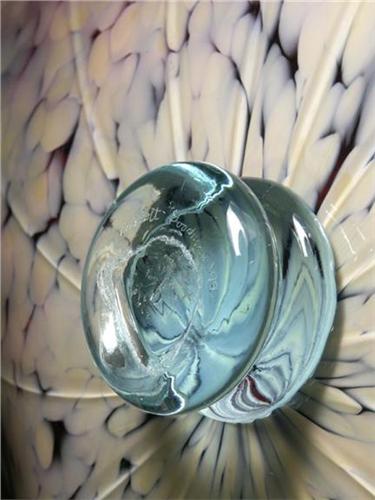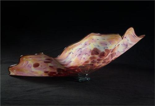 ART GLASS: A large thrown glass platter having undulating curves outlined in like muted reds and pinks fading into various irregular shaped oval and round forms which meet a series of much deeper red irregularly spaced forms which at the center are solid red. The base is a round clear circle 2 «'' D, the platter is designed to be wall hung or table displayed, signed ''Prescott Goodman'' and dated 1999, approximately 28'' in diameter, no damage or surface marks noted.