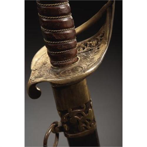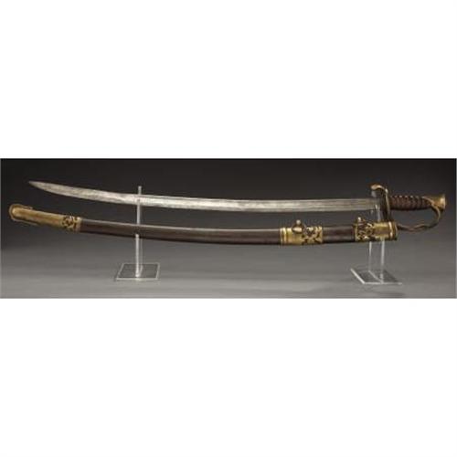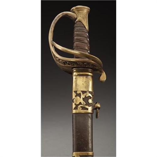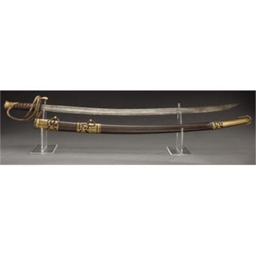 <B>PRESENTATION GRADE CONFEDERATE LEECH AND RIGDON CONFEDERATE STAFF OFFICER’S SWORD AND SCABBARD WITH ETCHED INSCRIPTION ON THE BLADE TO LIEUTENANT JAMES B. CONNER CO. K 5TH FLORIDA INFANTRY</B></I>. This is the very rare extra branch Leech and Rigdon staff officer’s sword with only six known and recorded specimens. The very light factory etched blade has an unstopped fuller and incorporates an ornate floral design with a gothic CSA and patriotic shield along with the etched inscription “Lieut. Jas. B. Conner”. James B. Conner was mustered into company K 5th Florida Infantry as a corporal on Feb. 20, 1862 and promoted to lieutenant March 23, 1863. He served with the 5th Florida, with several absences due to illness, until his capture at Sailor’s creek, April 4, 1865. He was held at Johnson’s Island until his release on oath of allegiance on June 18, 1865. The 5th Florida was part of the Florida Brigade of Mahone’s Division, A. P. Hill’s Corps, Army of Northern Virginia. This rare sword has a brass hilt with an additional outward branch that actually curls around behind the knuckle bow. Hilt rather crudely cast and finished with decoration on the front and back of the guard, which includes ‘CS’ on oval panel. Crudely cast decoration also on the pommel cap. The knuckle bow is pinned to the pommel. Original brown leather grip and twisted brass bare wrap. The most unusual feature of this sword is the iron scabbard which utilizes brass mounts that are hand cut and pierced with ornate cut outs. This is the exact sword that was featured on the Antiques Road Show from Dallas, TX. In 1997 and was purchased from direct lineal descendants of Conner. A very rare Leech & Rigdon with the added interest of a factory etched inscription and a unique presentation grade scabbard, in very desirable condition. <BR><BR><B>Condition:</B></I> The blade is smooth and dark gray with just some light scattered pitting near the tip. Brass hilt perfect, retaining the original leather washer, grip perfect and untouched with tight wire wrap. Iron scabbard with most of, what appears to be, the original blue finish, with just some light scattered surface rust and an old coat of lacquer. Surface also visible through the piercing of the scabbard mounts. No dents and nice honest wear on the bottom of the drag. All brass was lightly and expertly cleaned to remove dark green vertigis that covered most surfaces. Looks very nice and still retains an even patina.<BR><BR><b>Shipping:</b> Requires 3rd Party Shipping (<a target="_blank" href="http://www.heritageauctions.com/common/shipping.php">view shipping information</a>)