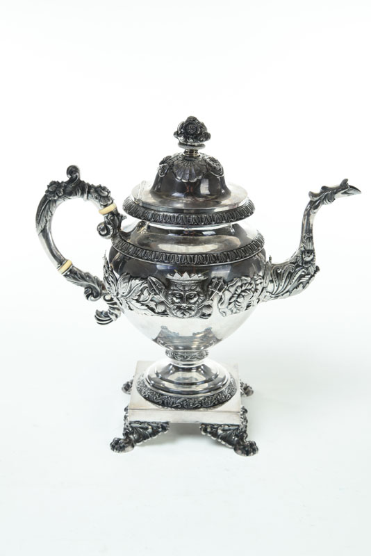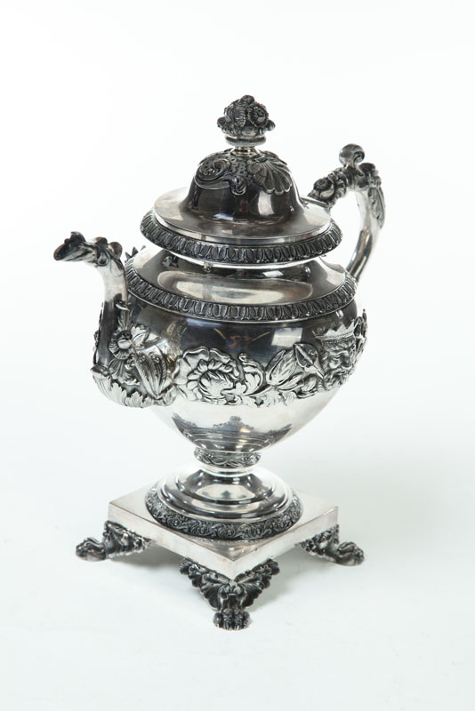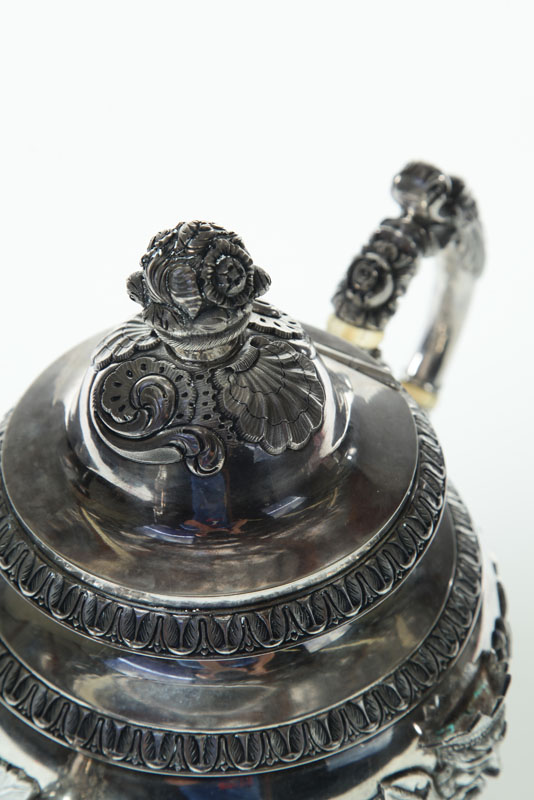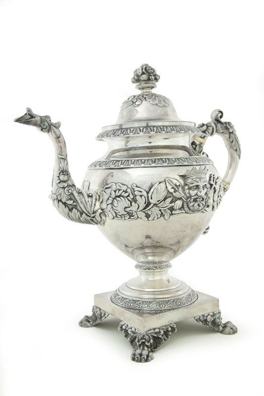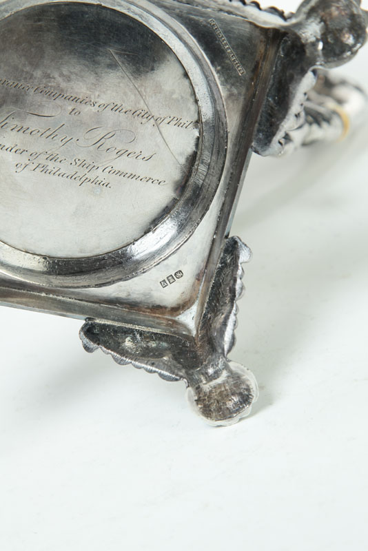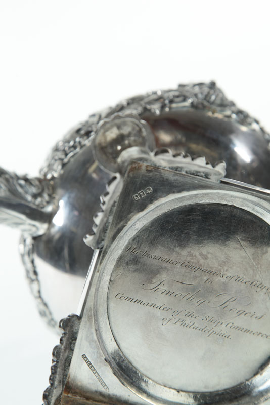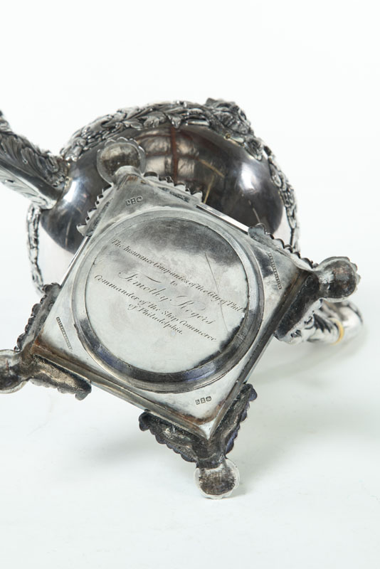 Bailey and Kitchen, Philadelphia, Pennsylvania, ca. 1835. Bulbous form with domed final resting on a square base with paw feet. Elaborate decoration includes flowers, scrolls, and on either side, Neptune's head and trident. Presented to Timothy Rogers, commander of the Commerce of Philadelphia, from the "Insurance Companies of the City of Phila." 11 1/2"h., approximately 58 ozt.