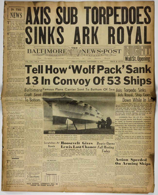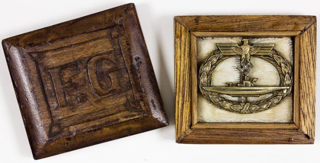 A presentation private-purchase U-boat badge adorned with diamond chips, presented to U-81 Capt. Friedrich ("Fritz") Guggenberger (1915-1988). This badge was almost certainly awarded to Guggenberger by the crewmen who served beneath him upon the occasion of his being awarded the Knights Cross a few weeks after the sinking of the Ark Royal, on Dec. 10, 1941. The badge is jeweler-made example of fire-gilt silver (marked "800" on reverse), the swastika inlaid with small diamonds. The badge is set into a fitted hand-made mahogany box, likewise constructed by crewmen, with his initials "F. G." carved on the top lid. The label of jewelry maker "Schwenk" in Freudenstadt has been varnished to the bottom of the box, the varnish appropriately aged. Provenance: TIME-LIFE Collection; The War Museum. Exhibition History: The Mariners' Museum, Newport News, Va., Exhibition: "Carriers, Codes and Silent Ships", 1996. Sold with a copy of the Baltimore News-Post, Nov. 14, 1941, the lead story reporting the sinking of the famous aircraft carrier. Guggenberger would sink a total of 17 vessels in his career, until his capture in May, 1943.