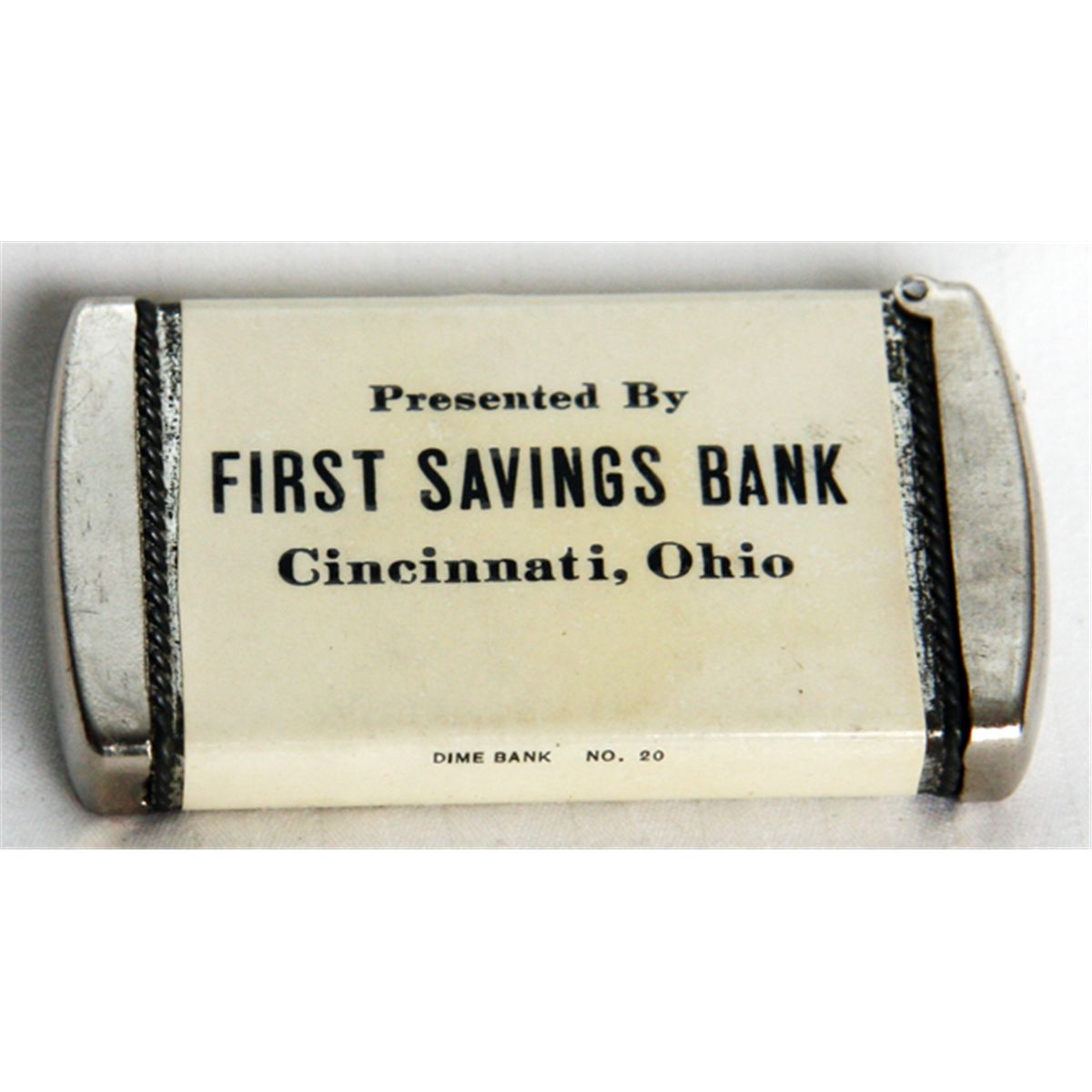 PRESENTED BY FIRST SAVINGS BANK/CINCINNATI, OHIO. ‘DIME BANK NO. 20. A small Pocket Bank. Coin opening on side below flip top. Bo handle, key lock, serial number or patent information. 6 1/2cm x 1cm x 3 1/2cm. White metal, with an embossed white card wrapper. Maker unknown. A small metal bank carried in a pocket to collect change. VF.