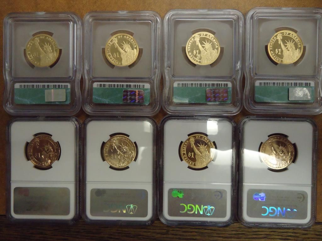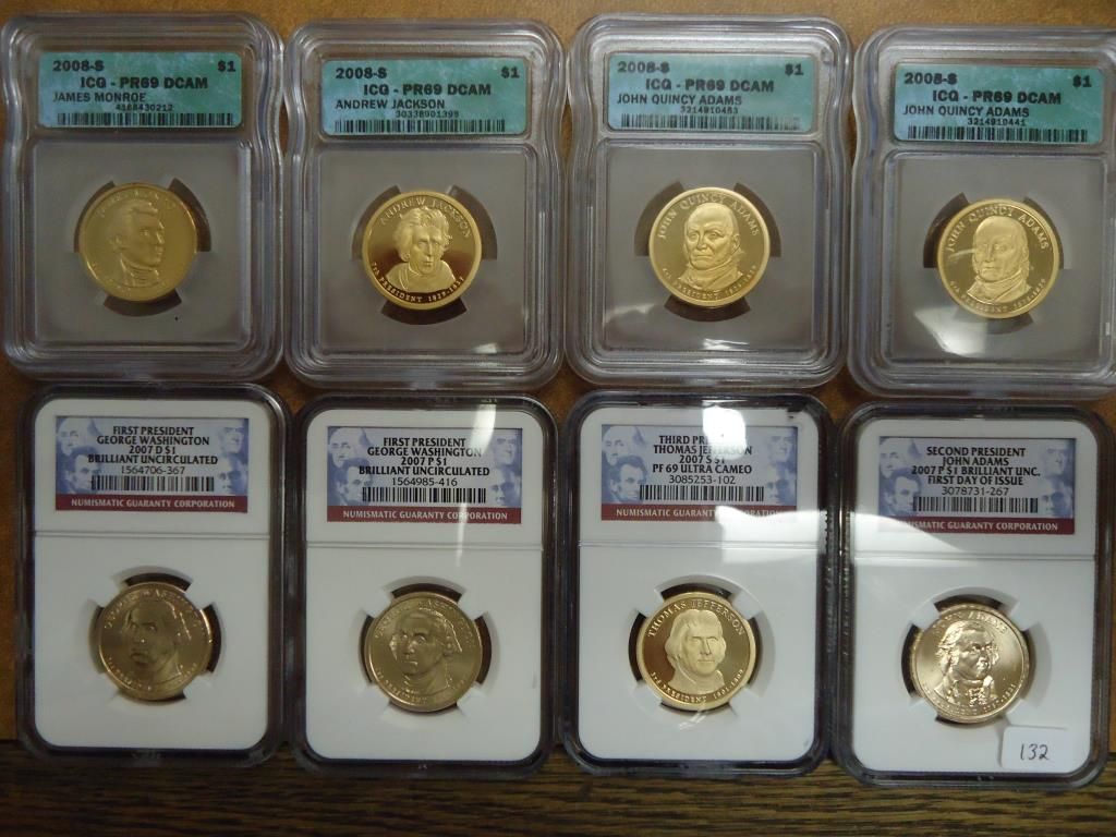 2007-P ADAMS NGC BRILLIANT UNC 1ST DAY OF ISSUE, 2007-S JEFFERSON NGC PF69 ULTRA CAMEO, 2007-P & D WASHINGTON NGC BRILLIANT UNC, 2-2008-S ADAMS ICG PR69 DCAM, 2008-S JACKSON ICG PR69 DCAM AND 2008-S MONROE ICG PR69 DCAM, 8 COINS TOTAL