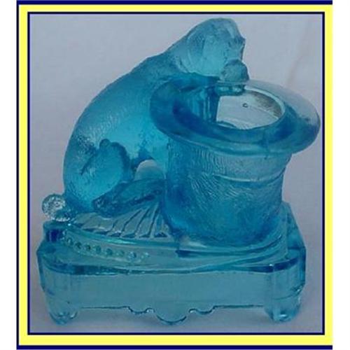 Pressed glass vaseline match safe toothpick holder in the form of a boxer dog holding a large tophat in his mouth. From a collection of turquoise blue pressed American vaseline glass, mostly dating to the 19th century. Unknown maker. Looks yellow under the black light.<BR>Measures 3 3/4 inches high and almost 3 1/2inches accross bottom. <BR>Rectangular base with rounded corners and scalloped apron. Beaded and domed with a boxer dog sitting atop, holding a tophat in his mouth.<BR>Condition is good. There is some roughage in the inside bottom rim of the base, which looks like some form of stress.No chips/cracks.