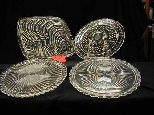 PRESSED CAKE PLATE LOT INCLUDES (1) SQ. SWIRL 12in X 12in, (1) BUBBLE SUNFLOWER BASE 11in, (1) FLORAL W/SCALLOP EDGE, (1) BUBBLE SWIRL 11in, ALL FTD., FOR DOME COVERS, 4 PCS