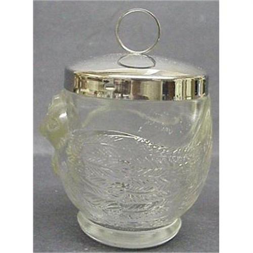 DOUBLE SIZE - FOR 2 EGGS, LOVELY CODDLER,MADE FROM PRESSED GLASS DEPICTING GLASS HEN,THE BOTTOM SHOWS W M F as a maker, IT STANDS 4 1/2" high, US Buyer to pay 7.00 for shipping plus insurance.THANK YOU!