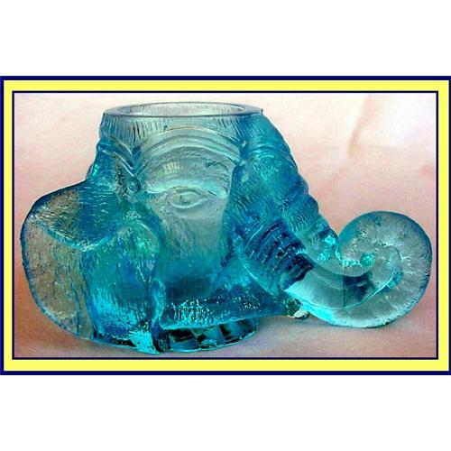 Pressed glass vaseline match safe / toothpick holder in the form of an elephant head. From a collection of turquoise pressed American vaseline glass, mostly dating to <BR><BR>the 19th century.<BR>Measures a little over 2 1/2inches high. 4 1/4inches from front to back.<BR>Match safe / toothpick holder in the form of an elephant's head. Curling trunk - glass looks almost crackled over smoothe tusk. Beaded head decoration and big <BR><BR>flappy ears. Looks yellow under black light.<BR>Mint condition.