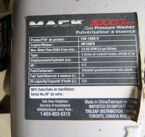 PRESSURE WASHER (MACK) *3000 PSI* (GAS) *14.5" W X 15.5" T X 15.5"L*