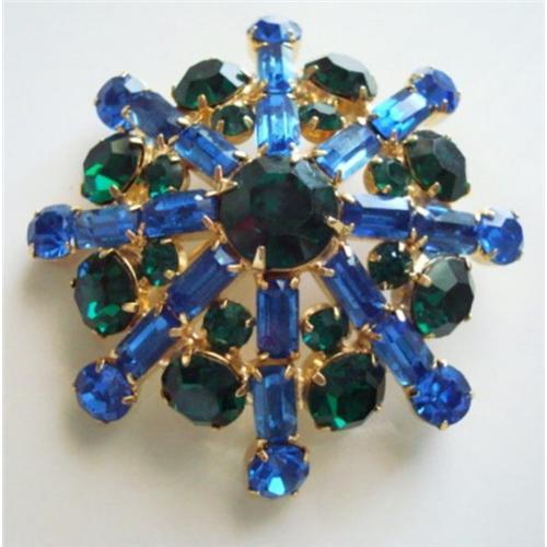 For sale I?m offering another outstanding ~Juliana~ Blue and Green Rhinestone Brooch. It?s in excellent condition both front and back. The back shows little to no goldtone wear. The back pin is in excellent condition and has working clasp that locks securely. There are no missing, discolored, loose or dead stones. All the stones are bright and shinny! Each stone is prong set. Don?t? let this beauty pass you up! Take advantage of my free shipping I?m offering at this time!