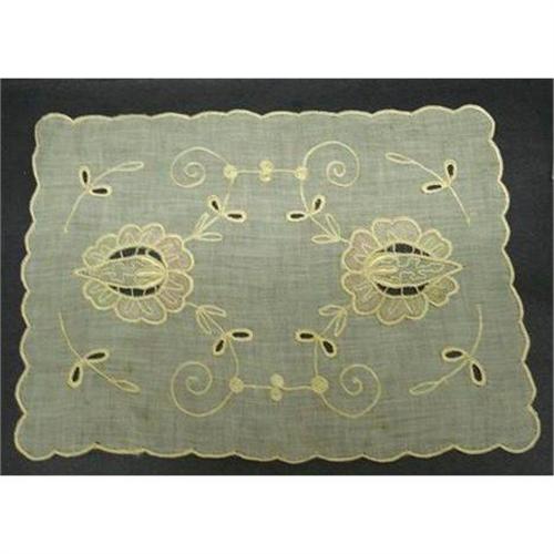 BEAUTIFUL ORGANDY CENTERPIECE - IT COMES IN LOVELY CREAM COLOR AND IS EMBROIDERED WITH SILK THREAD DEPICTING ROSES - VERY FANCY!, THERE IS SOME FANCY CUTWORK INVOLVED as per images, Measures about 14"X10" - US Buyer to pay 3.00 for shipping plus insurance.THANKS.