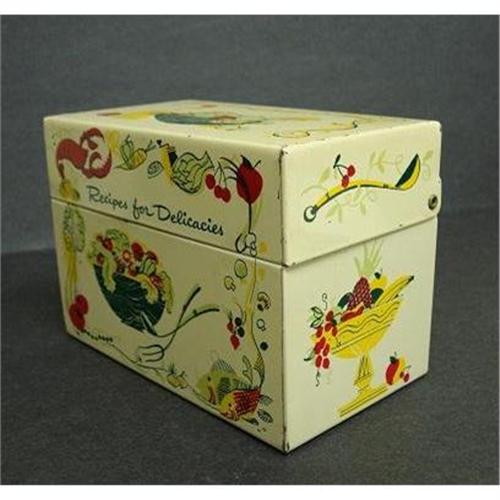 PRETTY RECIPE TIN BOX WONDERFULLY DECORATED, as for images - Excellent condition for age, most of ware shows underneath-corners,Please study the images as they are part of description.It measures about 3 1/4 inch high, over 5 inch long and 3 inch deep,US Buyer please remit 7.00 for shipping plus insurance.International Buyers please email us about shipping cost.THANKS.