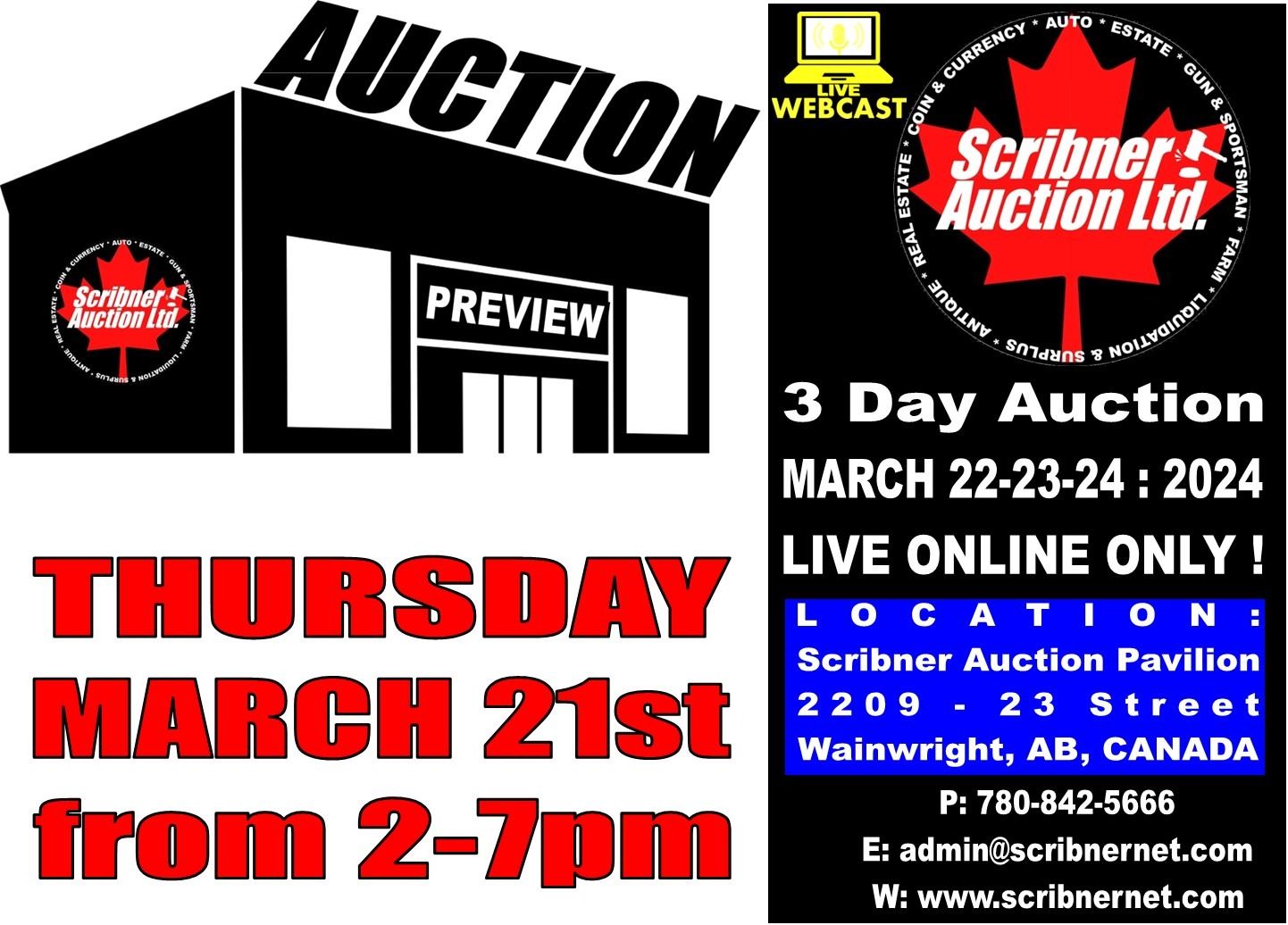 After an item has been sold, that item is the sole responsibility of the purchaser. All merchandise is sold AS IS/WHERE IS. No Guarantees or Warranties Given or Implied. Scribner Auction is not responsible for missing parts. No bidder shall retract his/her bid. All sales are final. Open house Preview on Thursday March 21st from 2pm - 7pm at the auction location (2209 - 23 Street Wainwright, AB, Canada) Preview is subject to change at any moment and is up to the discretion of Scribner Auction Ltd.
