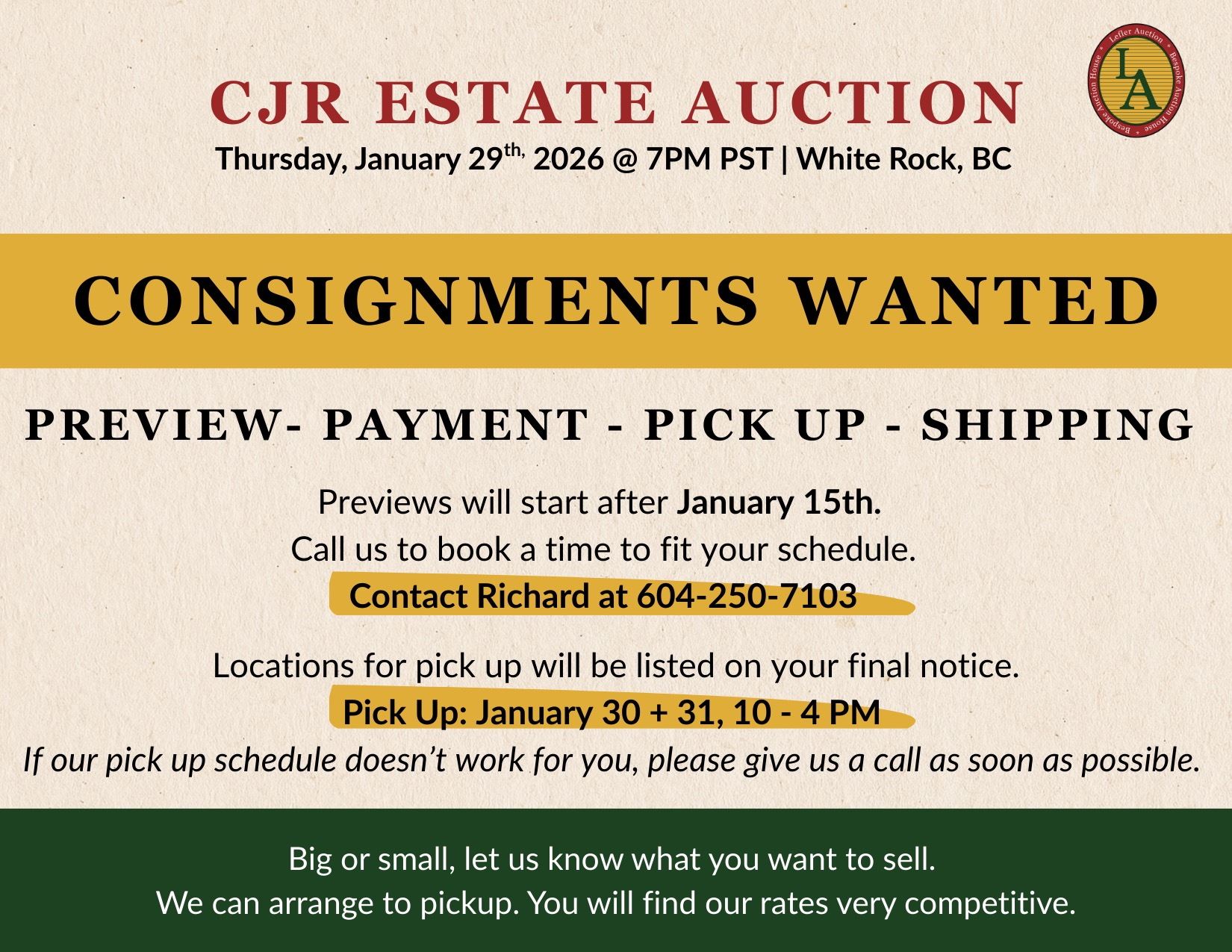 For any inquiries, please email leflerauction@gmail.com.