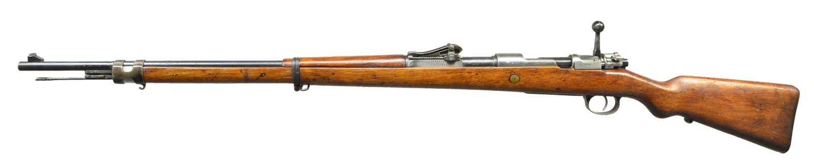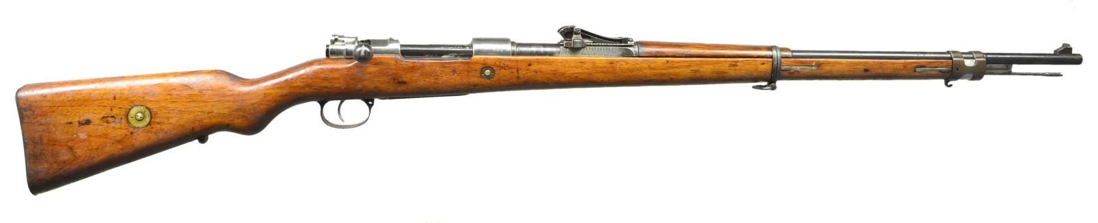 Cal. 8mm Mauser. S #3271a. Bbl. 29". Unnumbered cleaning rod mismatched rear sight tabs & bolt but all other visible numbers are matching. Left reciever side rail marked w/ gothic "GEW 98" marking. Top of receiver marked w/ Imperial crown, "DANZIG" & 1907 date. Right side of receiver has 3 German acceptance stamps. Buttplate is marked w/ serial number, a "4" depot stamp for the Cologne depot. Right side of disc has a reserve pioneer unit marking that reads "R.P. XVII.122" Lange viser rear sight graduated to 2000m. Inverted V front sight. Cleaning rod present. Bayonet bar present. Upper band has parade hook. Walnut stock w/ faint inspection stamps on right side of butt. Right sight is stuck & won't move forward. CONDITION: sanded stock w/ added varnish, scattered staining, dings & handling marks. Receiver, back half of bolt, trigger bolt release & front bandkeeper have been polished bright w/ scattered remnants of light pitting & light oxidation. Bolt body & cocking piece have a reblue finish w/ scattered thinning. Balance of metal retains 50% original blue w/ a ding on front of bbl., some cleaning scratches on rear of bbl, scattered oxidation most notably on bottom. scattered thinning & fading. Bore shows scattered dried grease unable to determine condition. (22-4065/MJC). CURIO. $500-700.