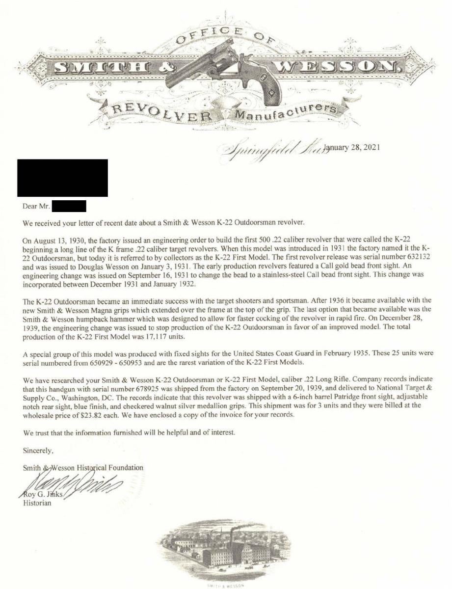 Cal. 22 LR. S 678925. Bbl. 6" pinned. Pre-war first model, mfg. 1939. Patridge front sight w/ silver bead. Adjustable rear sight. Blued finish. Case-colored hammer & trigger. Magna grips w/ silver S&W medallions. Right grip panel is stamp-numbered to frame. UNATTACHED ACCESSORIES: red factory box matching-numbered to the gun; a factory letter confirming the revolver's configuration and stating that it was in a three-gun shipment to National Target & Supply in Washington, D.C., on September 20th, 1939. Also included is a copy of the purchase order to National Target & Supply. CONDITION: grips show some dings on the bottom and scattered handling wear. Trigger & hammer show light operational wear but retain nearly all their original case colors. Balance of metal retains 90% of its original blue, w/ some edge wear, operational wear, some silvering, & light handling wear. Bright, near-excellent bore. PROVENANCE: from the Estate of Jon Thomas. (23-1627/MJC). CURIO. $1,500-2,000.