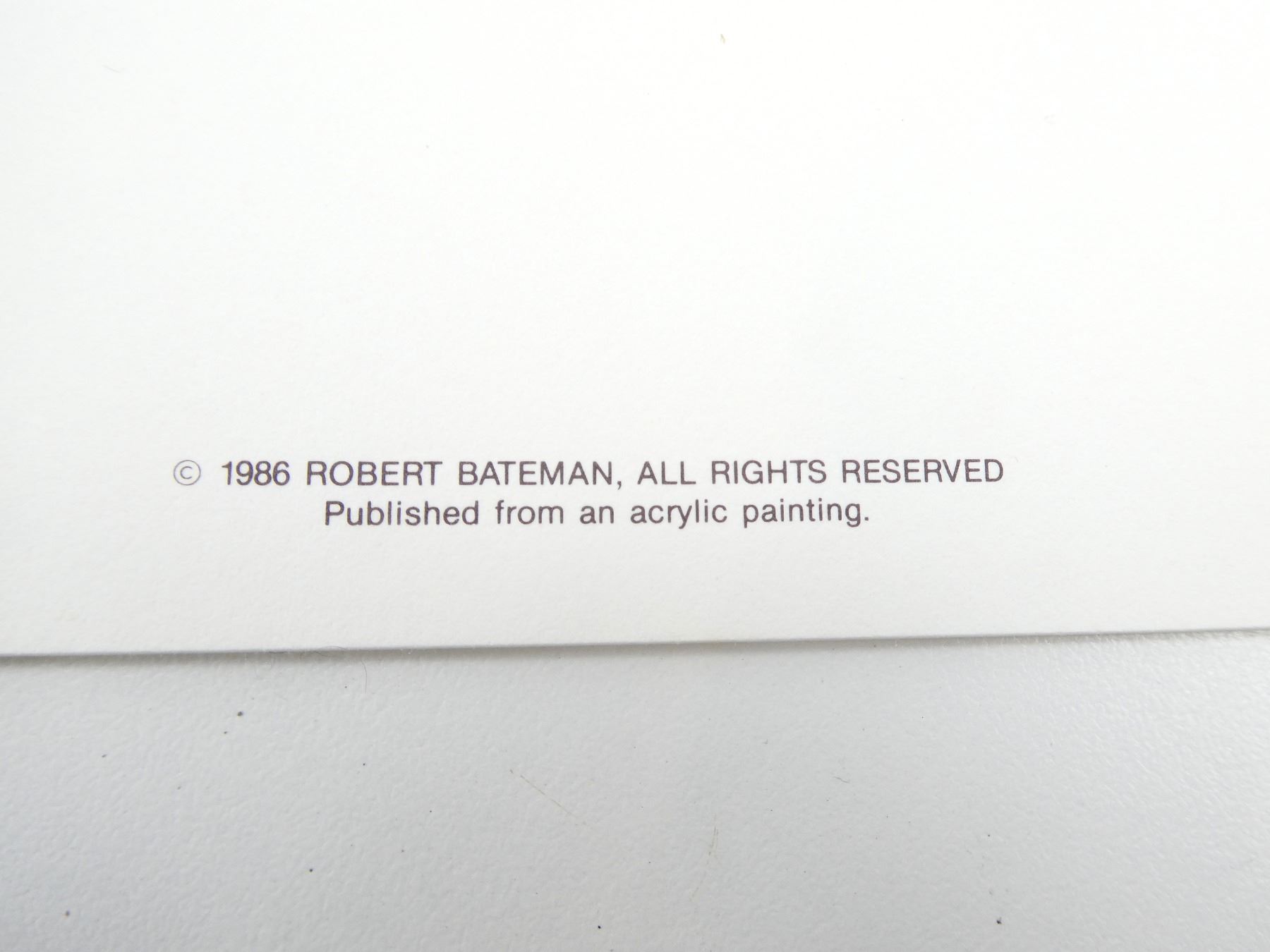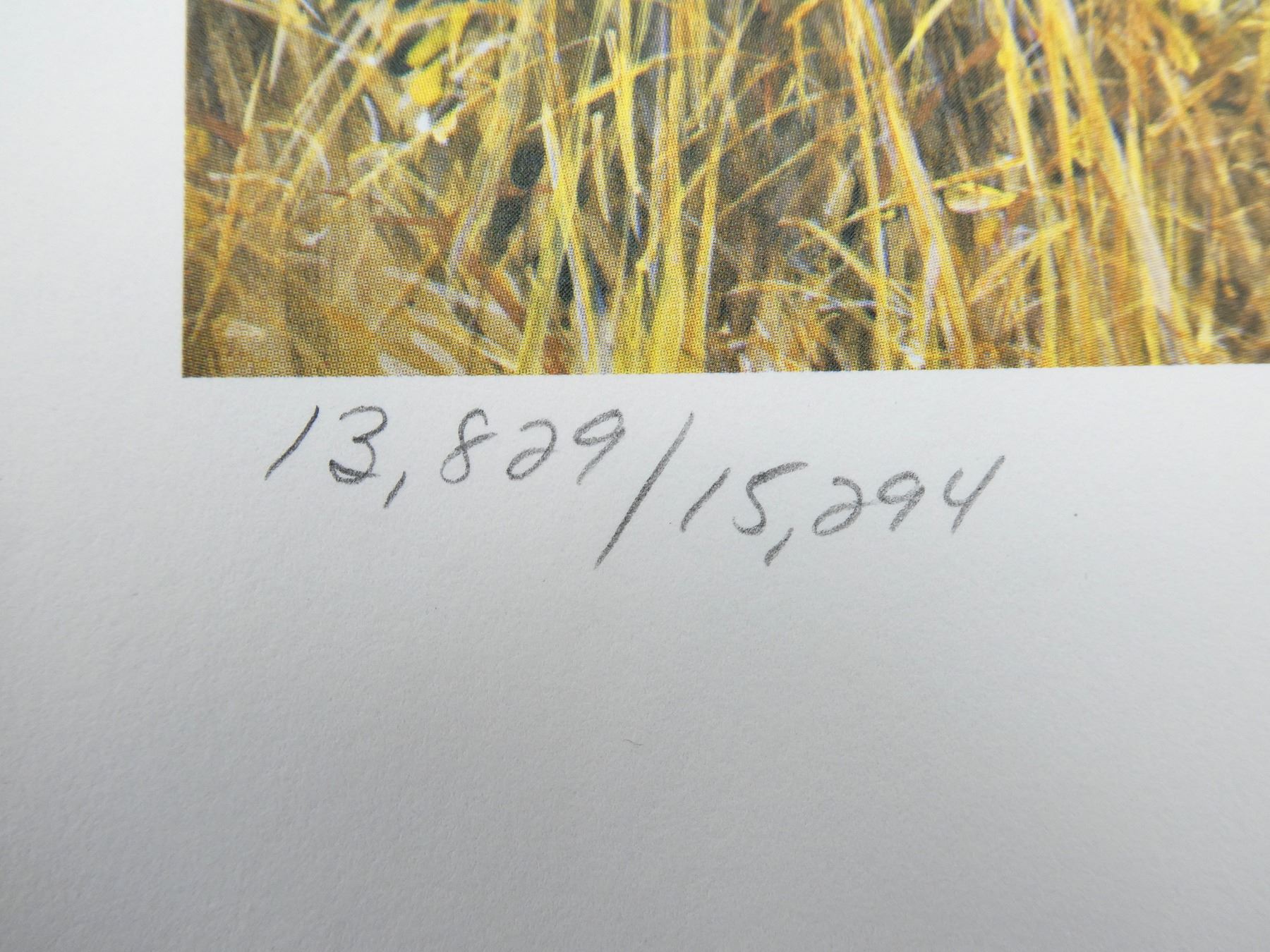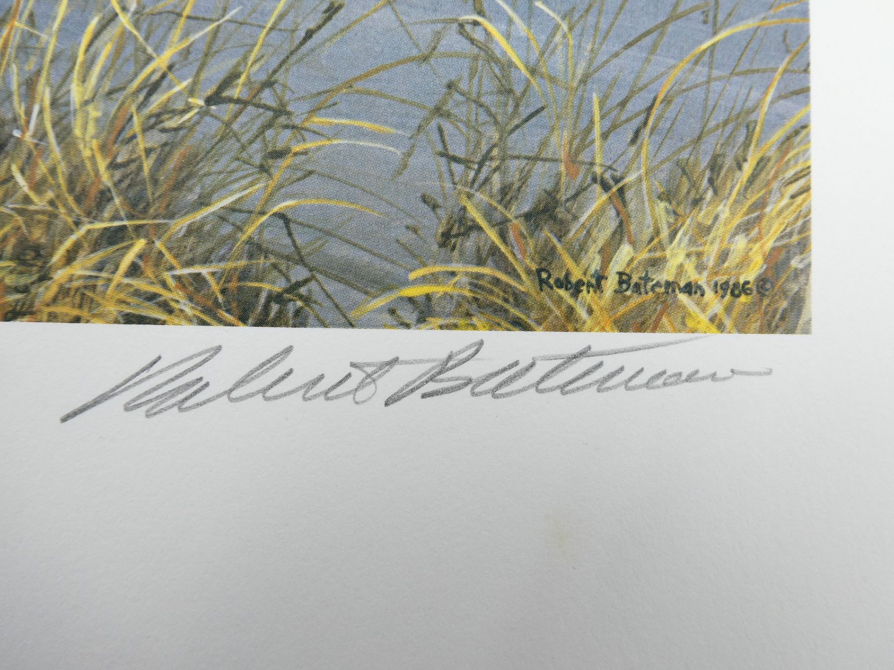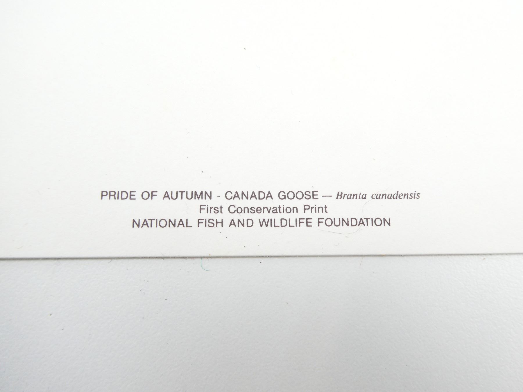 (1) BY ROBERT BATEMAN, WITH PRIDE OF AUTUMN - CANADA GOOSE STAMP, SIGNED BY ARTIST, PRINT 13,829/15,294, IN COLOUR, PUBLISHED BY MILL POND PRESS INC., COPYRIGHT 1986, SHOWS SIGNS OF WEAR AND TEAR, APPROX. 14" X 12". SEE PHOTOS.