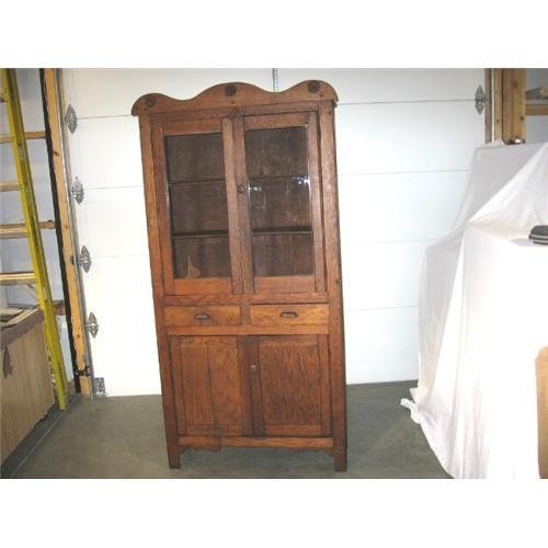 This is a great antique kitchen cabinet that is made of oak and has that wonderful primitive look. The wood has cracks and imperfections, and the cabinet leans toward the back. There is a scalloped top with three applied flower medallions. The two glass doors open to three wooden shelves. All three of these shelves are 35 1/2" from side to side and 12 7/8" from front to back. The top shelf is 14" in height, the second one is 10 1/8" in height, and the third one is 11" in height. Below these shelves are two drawers with metal handles. The drawers measure 3 3/8" in height, 13 3/4" from side to side, and 10 5/8" from front to back. The bottom part of the cabinet has two solid doors (one has a wooden knob) that open to two shelves. Both shelves are 35 1/2" from side to side, and 12 1/2" from front to back. The top shelf is 10 1/4" in height, and the bottom one is 11 3/4" in height. The over all dimensions are 76" tall by 39" wide and 16" deep.Total weight for the cabinet is 101 pounds. <p>We do have more photographs that we can email if you are interested. And if you have any questions please contact us by email or telephone before you purchase the item. Please view our Terms of Sale and Shipping policy. We only ship to the continental U.S. We do have a retail store and there are times the item may be sold through our store. We try to remove items immediately or the next day at the latest. Mixup's are bound to occur and if this happens we apologize for the confusion.