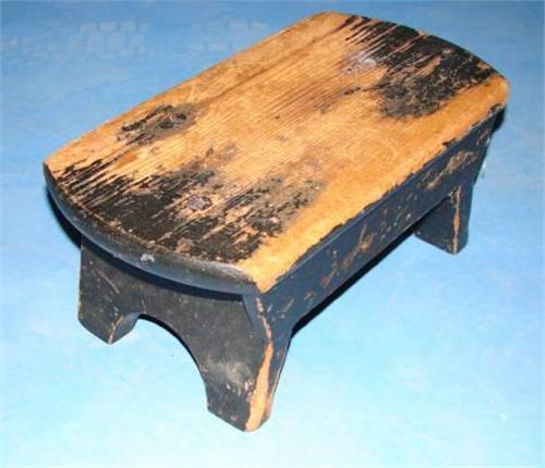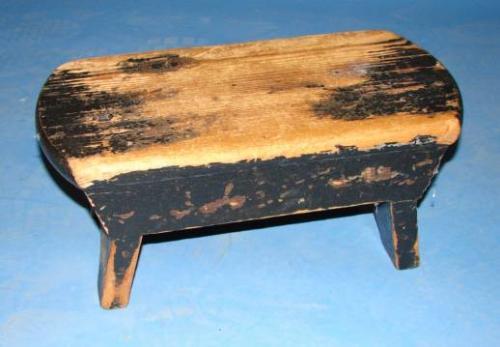 PRIMITIVE BLACK PAINTED SOFTWOOD FOOT STOOL. Top badly worn.