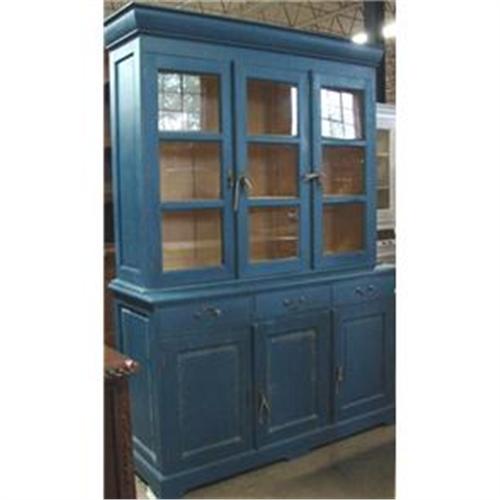 THIS IS A FANTASTIC PIECE ALL THE WAY AROUND WITH THREE GLASS DOORS TO THE TOP, THREE DOVETAILED DRAWERS TO THE CENTER AND THREE CABINET DOORS AT THE BASE THAT OPEN TO SHELVING FOR ADDITIONAL STORAGE. ALL THE DOORS HAVE SKELETON KEYED LOCKS WITH KEY. THE INSIDE IS THE ORIGINAL BUTTERCREAM COLOR WITH THE EXTERIOR IN A FABULOUS SHABBY PRIMITIVE BLUE PAINT. PLEASE EMAIL US FOR ADDITIONAL QUESTIONS.