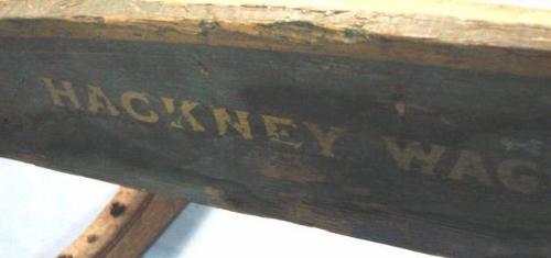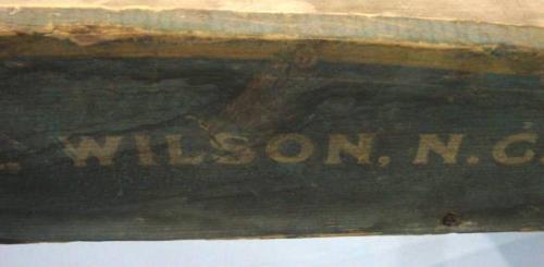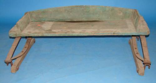 PRIMITIVE BUGGY SEAT. Green painted. Back of seat is stenciled on reverse "HACKNEY WAGON CO. WILSON, N.C.". Suspension shows major rusting and seat and back show loss to paint. 15" H, 41" W
