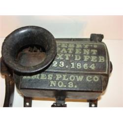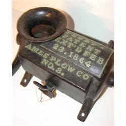 PRIMITIVE CAST IRON GRINDER. Marked on top "Perry's Patent Ext'd Feb. 23, 1864-Ames Plow Co.-No. 3". Wooden handle. 6.5" H