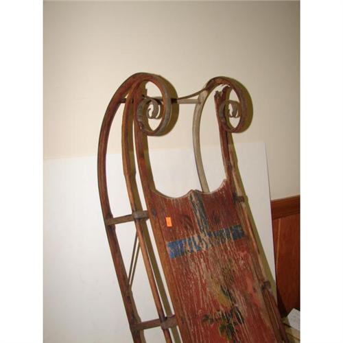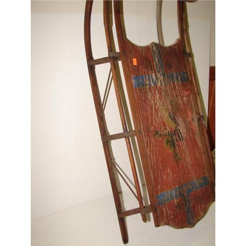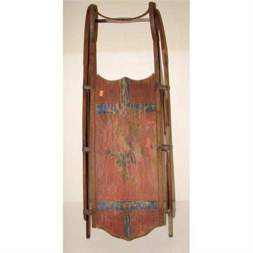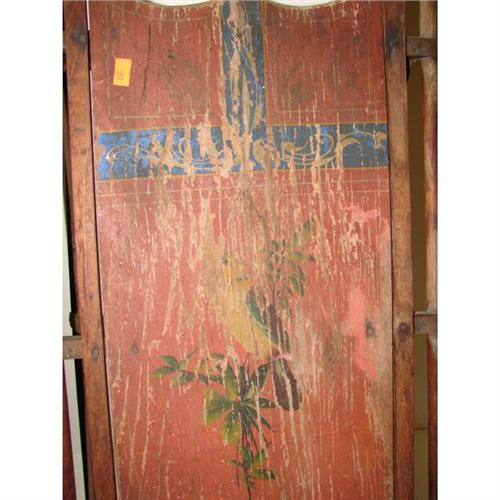 PRIMITIVE WOODEN CHILD’S SLED. Original red paint with green and blue floral decoration. Shows excessive wear and some loss to paint. 36” L