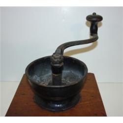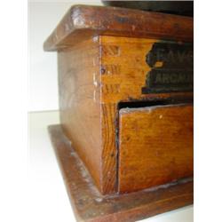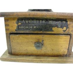 Primitive coffee grinder with single drawer. Marked with paper label on front "Favorite No. 67-Arcade Manufacturing Co."