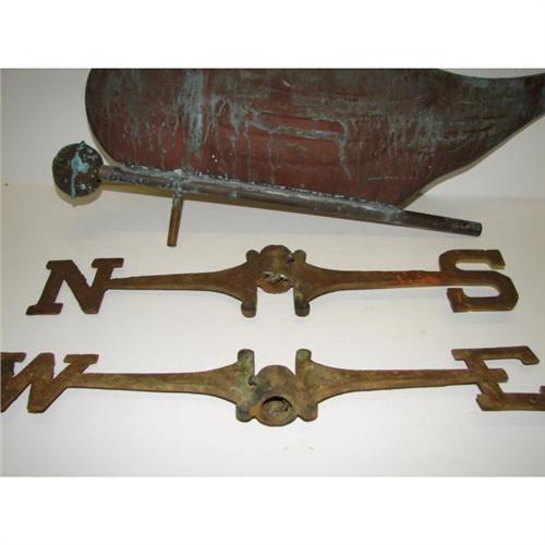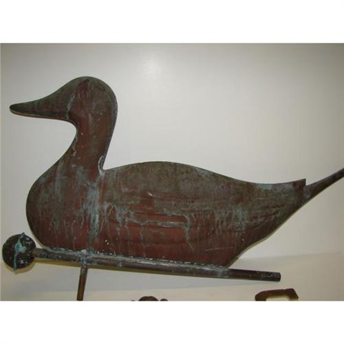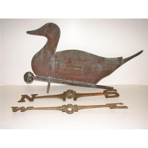 PRIMITIVE COPPER PINTAIL DUCK WEATHERVANE. Consists of copper pintail duck weather vane with cast iron North/South and East/West directionals. Missing pole support. Duck Weathervane: 14.5” H, 25.25” L. Directionals: 18.5” L.
